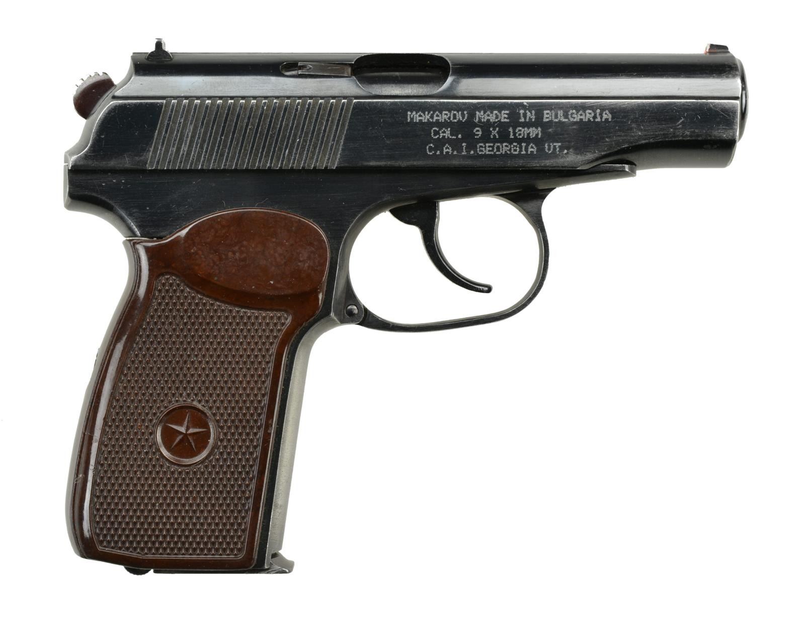 Cal. 9x18 Makarov. S #AE18261. Bbl. 3 3/4". Matching number on slide. Right side of slide has import marking. Right side of frame has Circle 10 arsenal marking & serial number. Frame has a date code 18, which indicates an Mfg. date of 1978. Brown bakelite checkered grips w/ star in center. MAGS: 2 8 rd. both have mismatched electro pencil numbers. UNATTACHED ACCESSORIES: cleaning rod & brown leather holster. Holster shows scattered crazing and scuffing. CONDITION: grips show light scratches & handling wear. Metal retains 70% original blue w/ a couple patches of light pitting on slide, scattered silvering most notably on top of slide & straps. Very good bore w/ some light frosting. (22-2434/MJC). MODERN. $200-300.