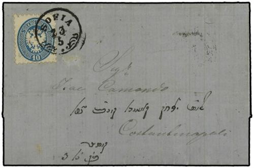 1867 (May 23) Entire letter from Sofia to Constantinople franked by perf 9½ 1864 10 soldi blue tied by superb strike of "Sofia" cds in black. Constantinople double ring arrival on reverse of scarce entire. Scott 23.