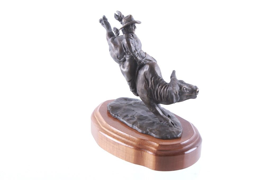 Offered in this lot is an original Limited Edition Bronze , "BULL RIDER" by Mike Capser, 329/950. Bronze comes with a detached finished wood base for mounting. Signature is noted incised on the top of the bronze base platform with the date '80', the underside of the bronze platform has 329/950 stamped. Excellent detail on both the cowboy and the Brahman bull. A wildlife and landscape painter, especially of pristine watercolors, artist Mike Capser was raised on a cattle ranch in the Crazy Mountain Range of Southwest Montana. He started sketching his surroundings as a youngster, and at age seven, a visit by him to the Buffalo Bill Historical Society in Cody, Wyoming sealed his determination to become an artist. He first decided to become a western painter like Frederic Remington and Charles Russell, but he later changed to wildlife and landscape. He maintains a studio in Billings, Montana where he has a sweeping view of the northern edge of Yellowstone Valley. He is basically a self-taught artist, who began sketching while working on the ranch to pass the time.
