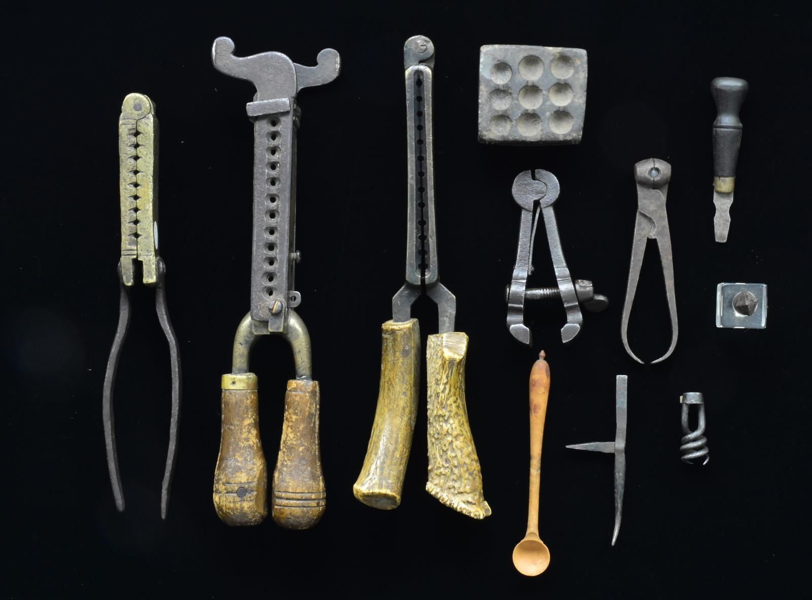 This varied group includes 1 early shot gang mold measuring approx. 10 1/4" long. Mold has iron pour plates top & bottom w/ a brass central mold. Brass is marked on both sides “SS”. Wooden handles w/ brass ferrules (1 missing). / 1 Early brass shot & rnd. ball mold w/ iron handles. Measures approx. 9 1/2" long. Mold casts 9 shot pellets w/ 4 rnd. balls of varying calibers. / 1 Early brass shot gang mold w/ antler handles measuring approx. 11". / 1 Half of an early soapstone bullet mold for casting 9 rnd. balls of similar calibers. Outside of mold has incised lineal decoration. / 1 Turned wooden scoop measuring 5" long. / 1 Early mainspring vise. / 1 Single cavity rnd. ball scissor type mold. / 1 Sm. early screwdriver. / 1 Musket tool. / 1 Musket worm. / 1 Crossbow bolt point. CONDITION: all items show substantial & heavy use & wear but are complete & function well except as noted. PROVENANCE: From the Collection of John "Tim" Breth Jr. (02-13832/BF). $500-800.