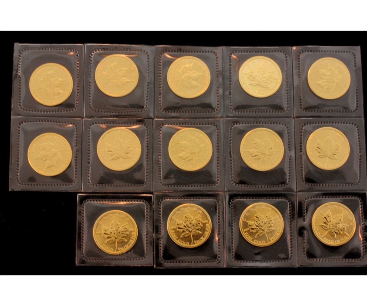 BULLION: [14] 2008 $5 1/10 oz. Canadian Gold Maple Leaf 9999 fine gold.