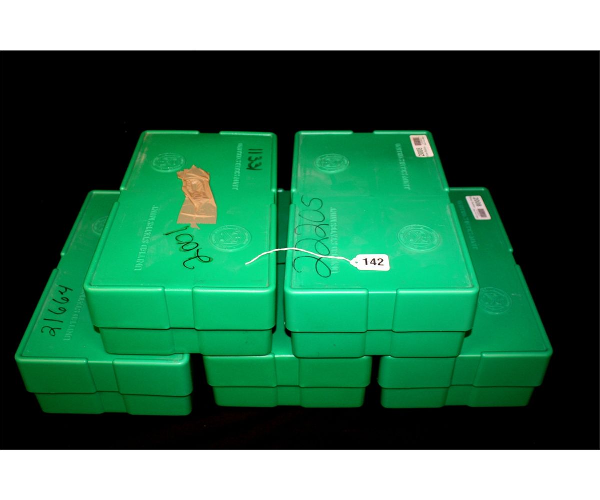 BULLION: (2500) 2008 American Eagle silver dollar coins; uncirculated, West Point Mint; packaged in green plastic US mint cases, each with 500 coins (twenty-five 20 coin plastic sleeves). Case numbers: 22212, 21657, 21667, 22200 & 25402.