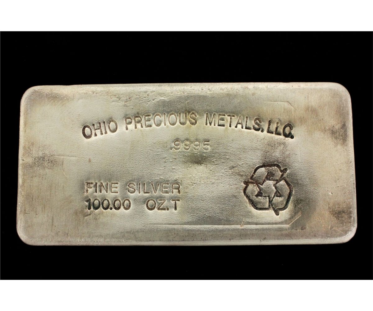 BULLION: US Ohio Precious Metals LLC 100 troy ounce 9995 fine silver bar; no serial number.