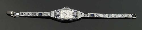 BULOVA LADIES WRISTWATCH. Watch accented with synthetic blue sapphire melees on a white gold plated strap. Art deco style. SIZE: 6” l. CONDITION: Very good. 9-27261
