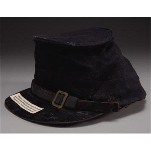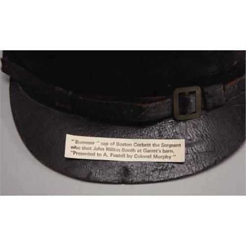 <B>BUMMER CAP OF SERGEANT THOMAS P. “BOSTON” CORBETT, THE MAN WHO SHOT JOHN WILKES BOOTH, 1865.</B></I><BR> The unique forage cap of the mysterious and tormented Sergeant Boston Corbett of the 16th New York Cavalry. The Union soldier that shot and killed Abraham Lincoln's assassin, John Wilkes Booth. Presented to Al. Fostell by Col. Murphy<B>. </B></I><BR><BR>Corbett was born in London, England. His family immigrated to New York in 1839 <BR>He eventually took on the trade of a hatter in Troy, New York. There has been speculation that the use of mercury as part of the hatter's trade was the cause of Corbett's later mental problems. Following his wife’s death, Corbett moved to Boston, and continued working as a hatter. He became a born again evangelical Christian and changed his name to Boston. He began to wear his hair very long. On July 16, 1858, in order to avoid the temptation of prostitutes, Corbett castrated himself with a pair of scissors. Afterward, he ate a meal and went to a prayer meeting before going for medical treatment. <BR><BR>The self-mutilation did not keep Corbett from enlisting at the start of the war and then reenlisted twice more. He was captured by Confederate partisan John Mosby in June 1864 and sent to Andersonville Prison. He escaped, was recaptured, and spent the rest of the war in Andersonville until liberated near the end of hostilities. Corbett was selected as part of the detachment that pursued Booth, ultimately cornering him at the Garrett farm. Corbett claimed God ordered him to disobey orders and shoot Booth. He was arrested for violating that order, but Edwin Stanton pardoned him.<BR><BR><B>Provenance: </B></I><I>Al. Emmett Fostell Collection,</B></I><B><I> </B></I></B></I><I>catalog item # 687</B></I><BR><BR><B>Condition:</B></I> Very fine <BR><BR><b>Shipping:</b> Miscellaneous Collectibles, Smal (<a target="_blank" href="http://www.heritageauctions.com/common/shipping.php">view shipping information</a>)