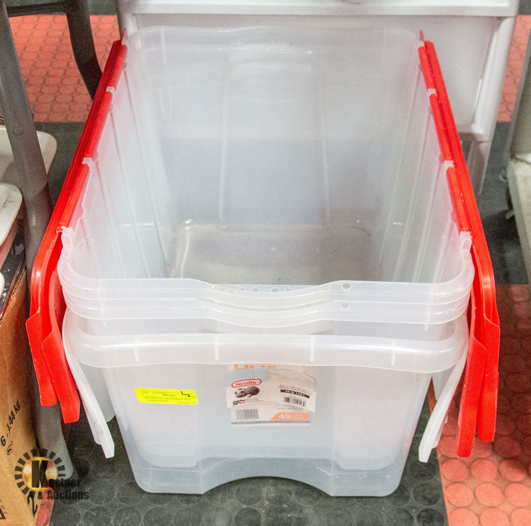 TOTES INCLUDES TWO HDX 49 L TOTES AND ONE STERILITE 45 L TOTE **ALL ITEMS MUST BE REMOVED BY 5PM SATURDAY, JULY 29TH 2023. ALL REMAINING ITEMS WILL BE SUBJECT TO A $6.00 PER DAY STORAGE CHARGE. ANY ITEMS REMAINING AFTER MONDAY, AUGUST 14TH, 2023 WILL BE CONSIDERED FORFEITED. NO REFUNDS WILL BE ISSUED FOR FORFEITED ITEMS. TO SCHEDULE A PICK UP APPOINTMENT CLICK HERE