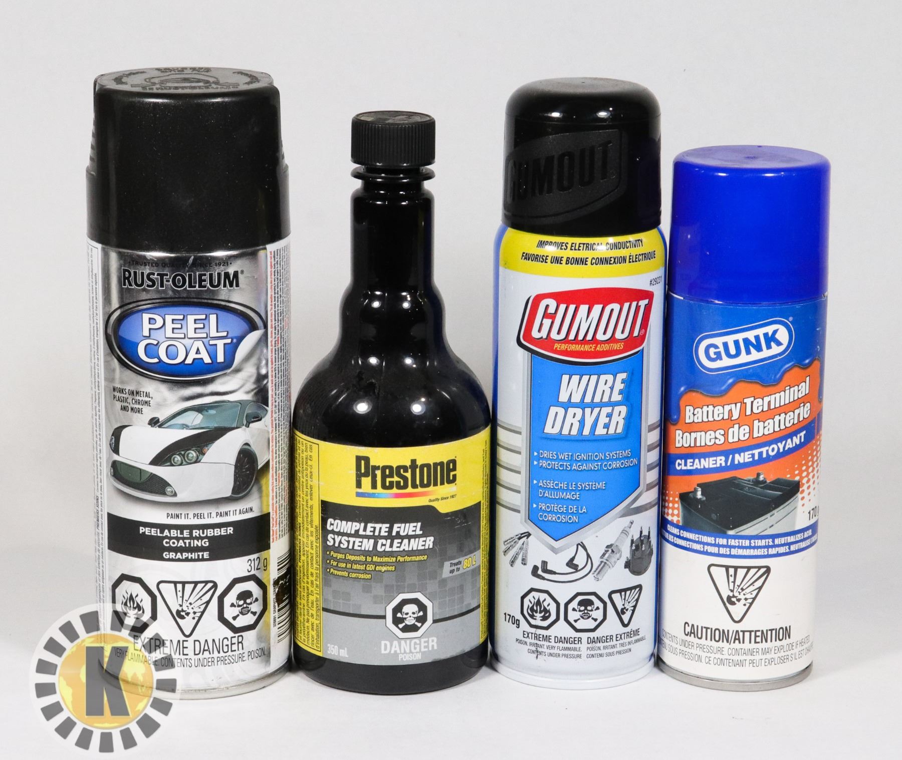 INCLUDES PRESTONE COMPLETE FUEL SYSTEM CLEANER, GUMOUT WIRE DRYER, RUST-OLEUM PEEL COAT, AND GUNK BATTERY TERMINAL CLEANER***ITEM(S) LOCATED IN LETHBRIDGE ALBERTA, TRANSPORT TO EDMONTON AVAILABLE FOR SMALL ITEMS ONLY (PLEASE READ AUCTION DESCRIPTION FOR MORE INFORMATION)