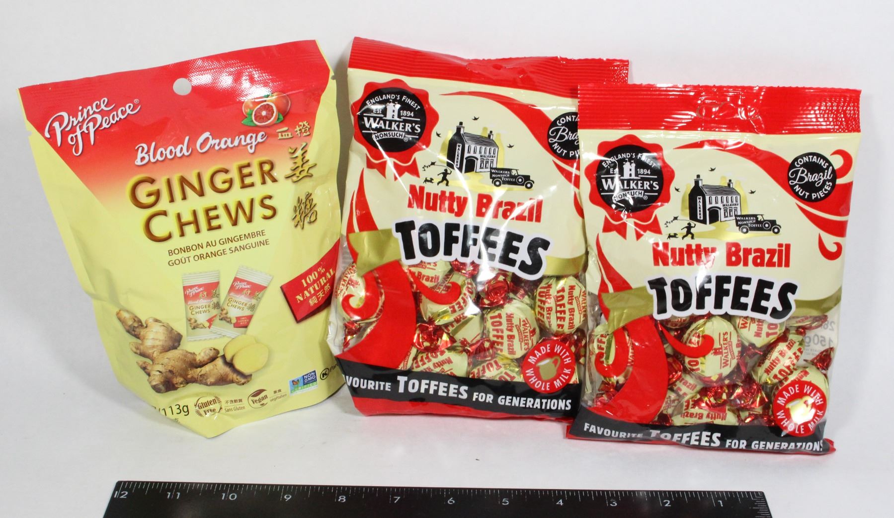 PEACE BLOOD ORANGE GINGER CHEWS, AND 2 150G BAGS OF WALKER'S NUTTY BRAZIL TOFFEES (ONE BAG OPEN) GINGER CHEWS BEST BEFORE: 2026.03.11. NUTTY BRAZIL TOFFEES BEST BEFORE: 28/08/25