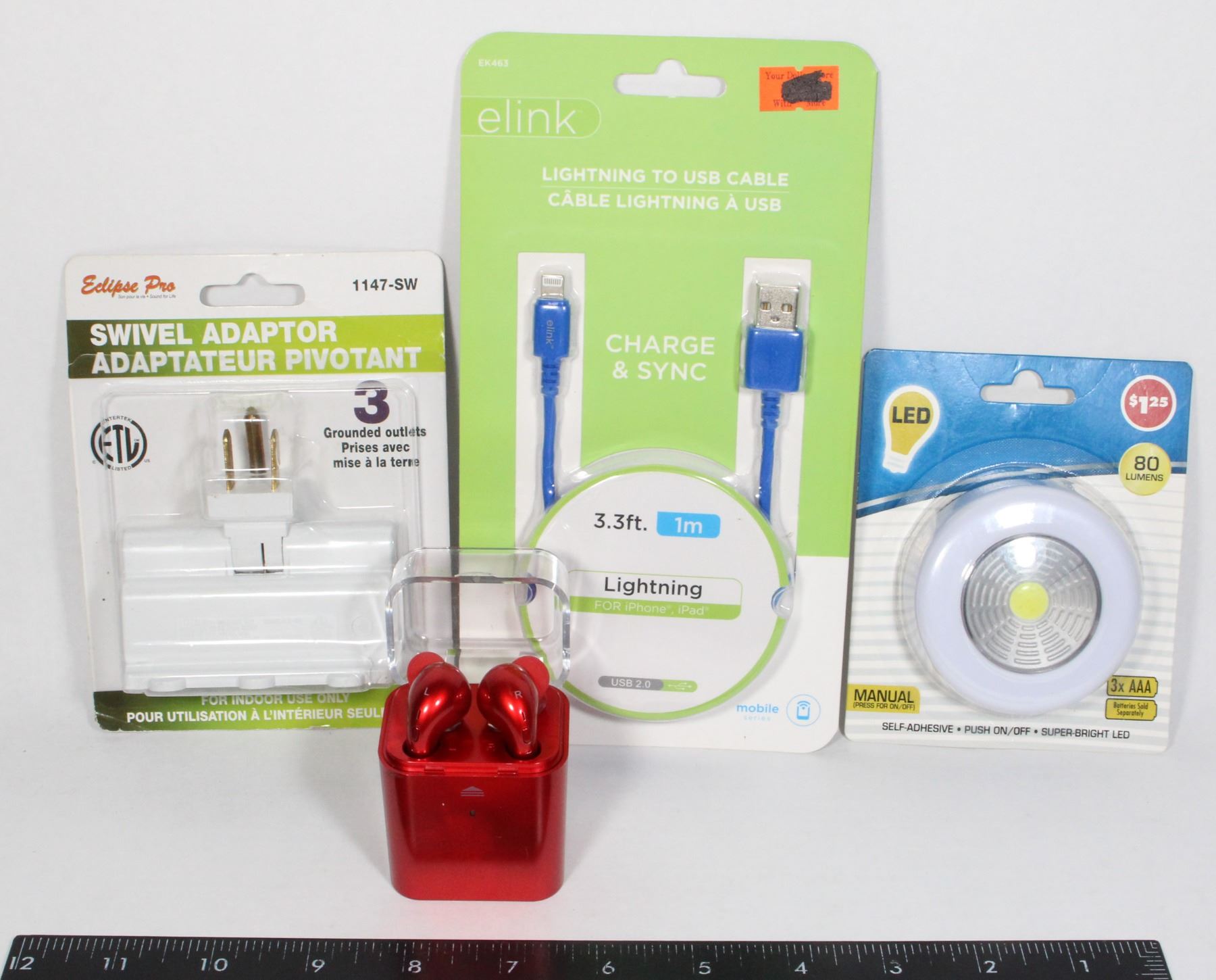EARBUDS, LED AAA POWERED PUCK LIGHT, 1M LONG USB LIGHTNING CABLE, AND SWIVEL POWER ADAPTOR