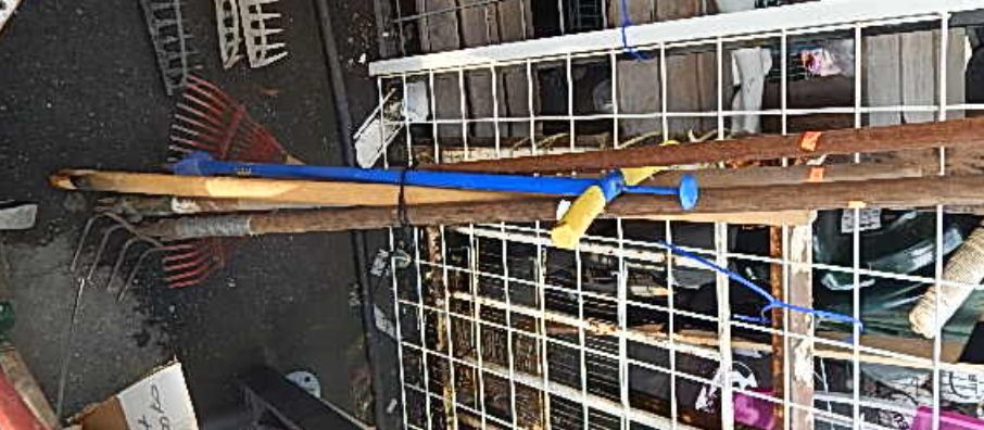 BUNDLE OF GARDEN TOOLS - LEAF RAKE, CULTIVATOR, WEED PULLER & HANDLE