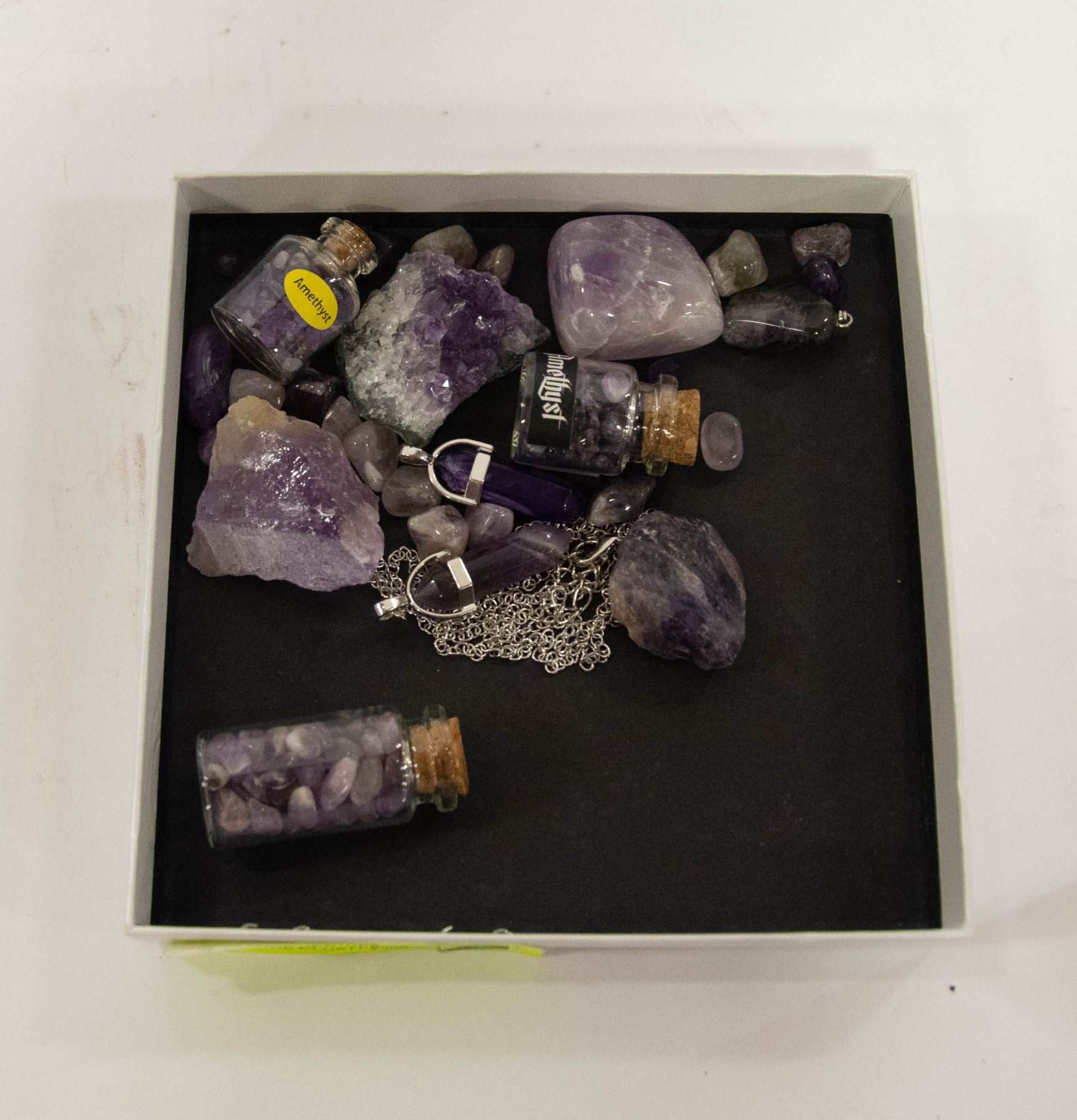 SPECIMENS ROUGH (RAW) AND POLISHED + POLISHED AMETHYST PENDANTS & MINI GLASS CORK LIDDED JARS FILLED WITH POLISHED AMETHYST STONES **ALL ITEMS MUST BE REMOVED BY 5PM SATURDAY, MARCH 18TH 2023. ALL REMAINING ITEMS WILL BE SUBJECT TO A $6.00 PER DAY STORAGE CHARGE. ANY ITEMS REMAINING AFTER MONDAY, APRIL 3RD, 2023 WILL BE CONSIDERED FORFEITED. NO REFUNDS WILL BE ISSUED FOR FORFEITED ITEMS. TO SCHEDULE A PICK UP APPOINTMENT CLICK HERE