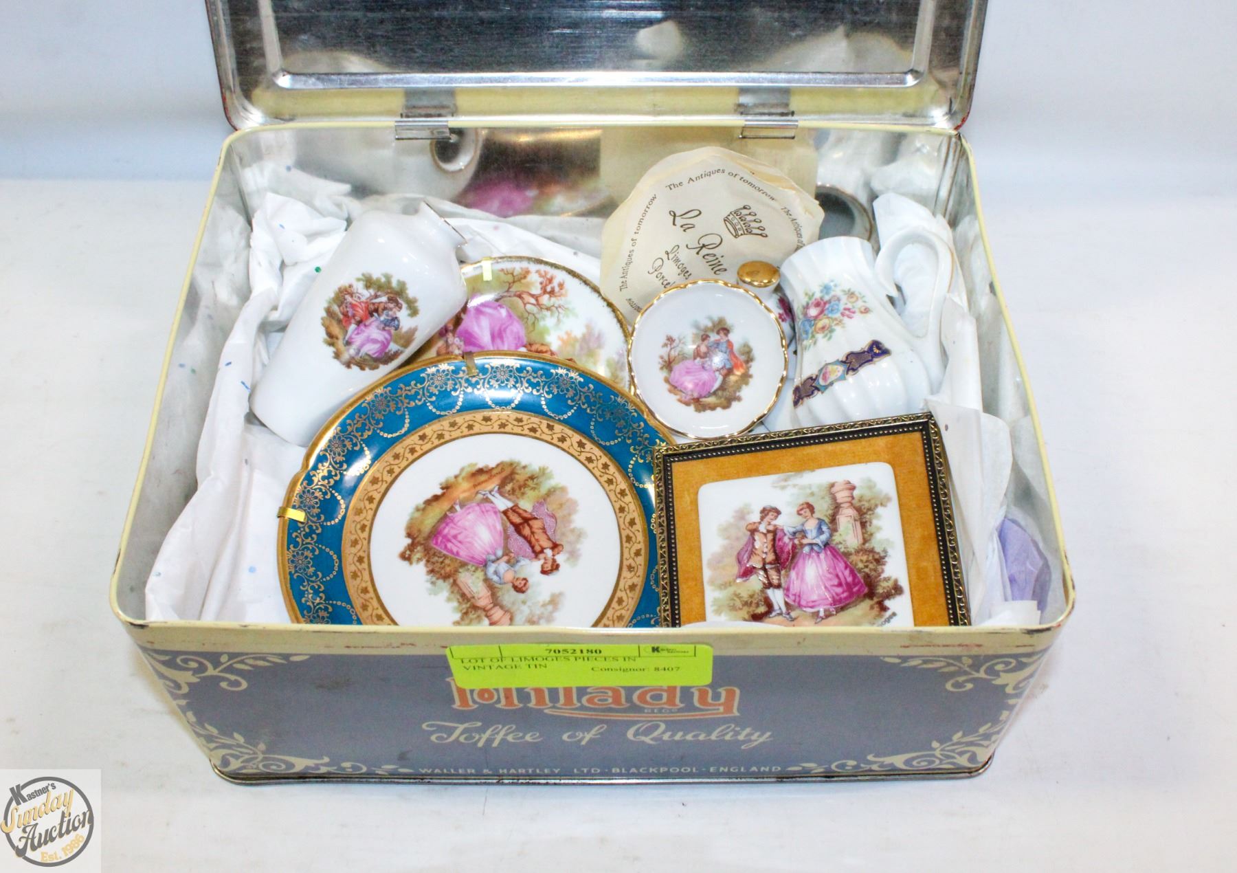BUNDLE OF LIMOGES PIECES IN VINTAGE TIN