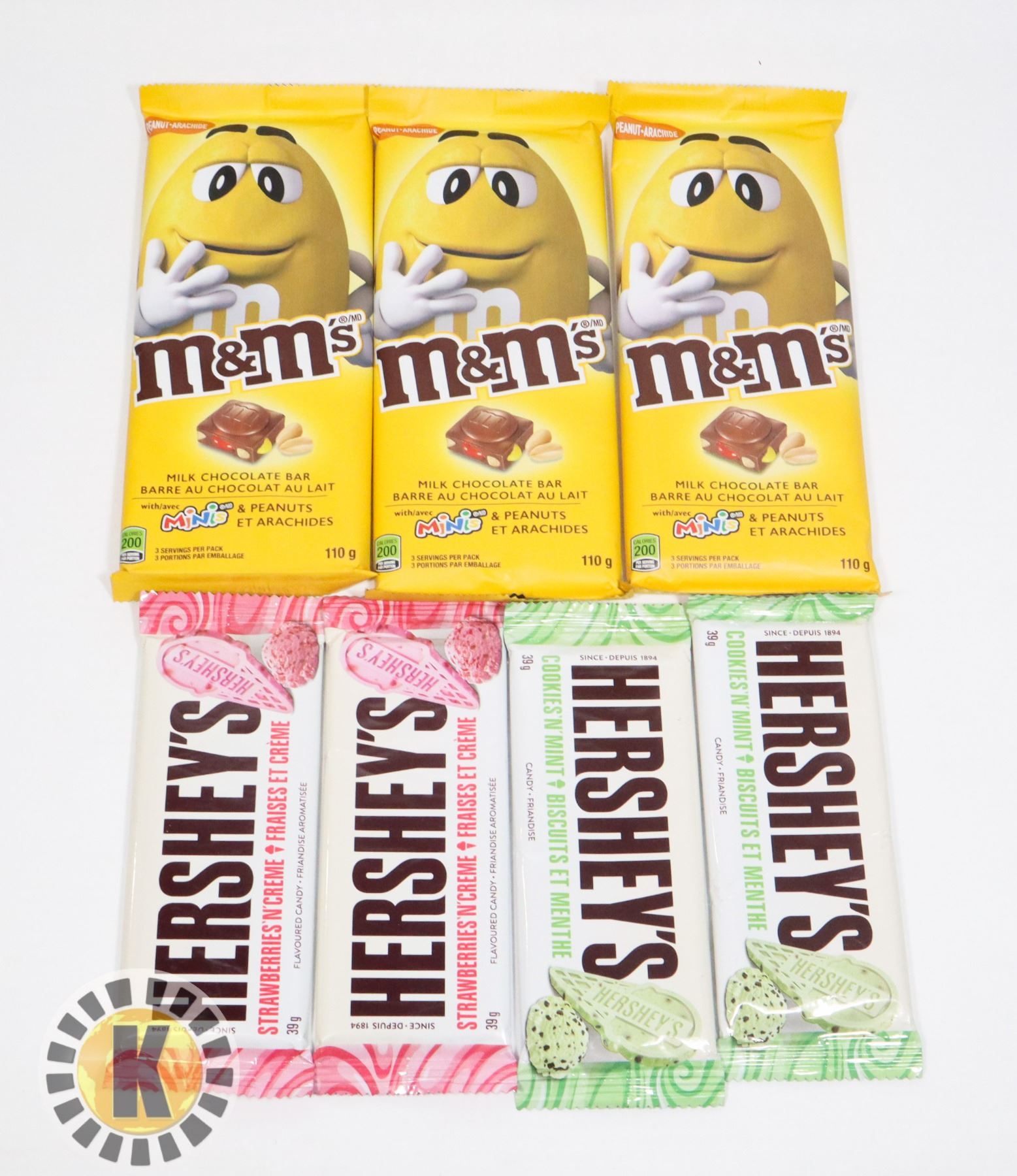 CHOCOLATE BARS WITH MINIS AND PEANUTS (110G EA, BEST BEFORE HARD TO READ, SOMETIME IN 2022), AND ASSORTED HERSHEY'S CREAM (39G EA, BEST BEFORE FEB 2022)***ITEM(S) LOCATED IN LETHBRIDGE ALBERTA. SMALL ITEMS ONLY ARE AVAILABLE FOR FREE TRANSPORT TO EDMONTON OFFICE (READ AUCTION DETAILS FOR MORE INFORMATION)
