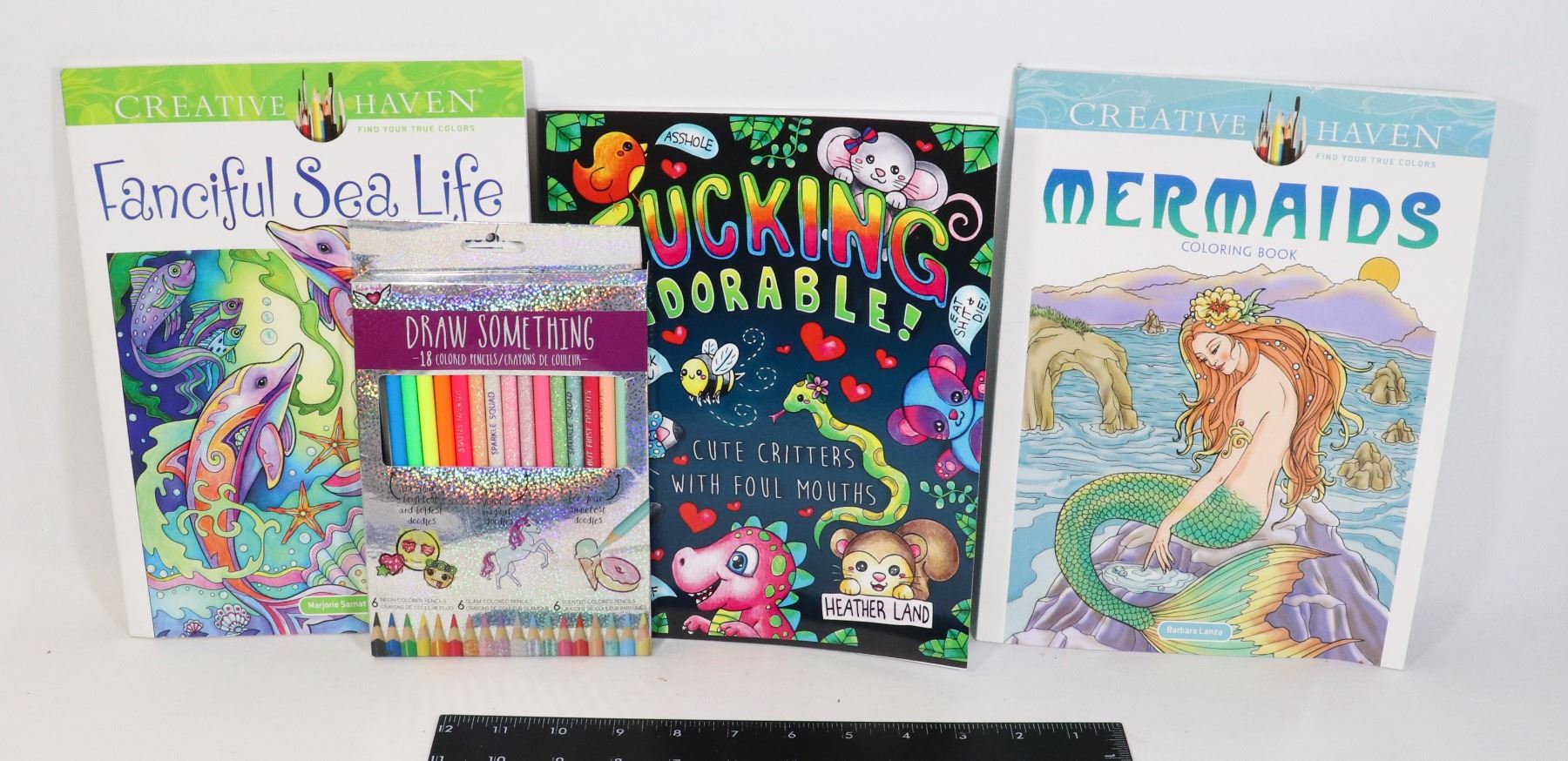 TWO NEW ADULT COLOURING BOOKS AND PACK OF PENCIL CRAYONS (ONE MISSING, 3 SHARPENED, 14 ARE NEW)