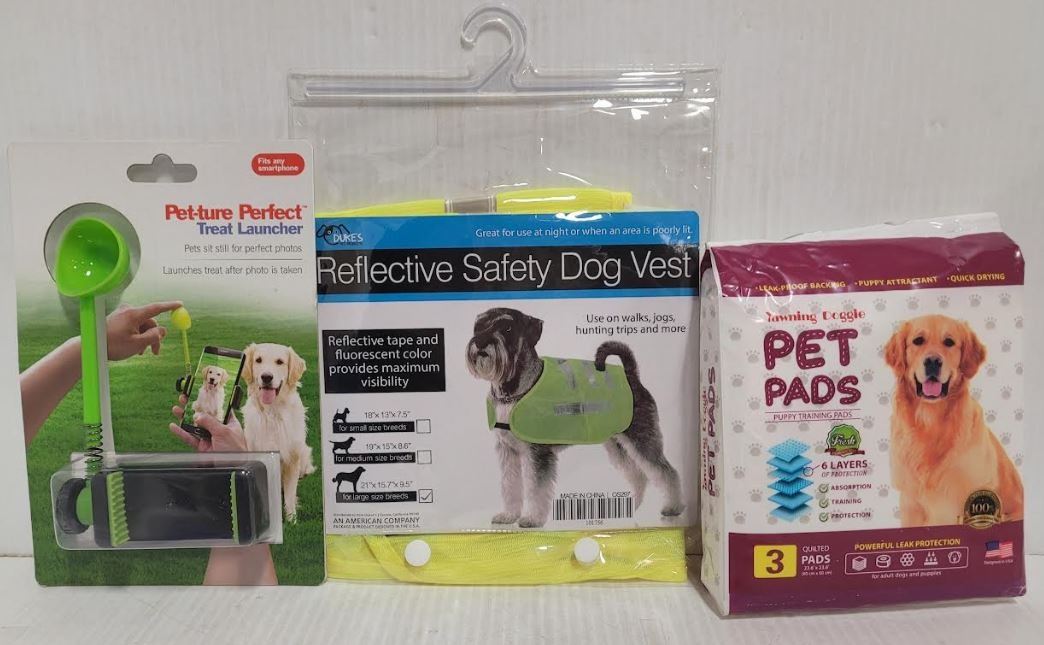 PET-TURE PERFECT TREAT LAUNCHER, YAWNING DOGGIE PET PADS POWERFUL LEAK PROTECTION, DUKES PET PRODUCTS REFLECTIVE SAFETY DOG VEST FOR MEDIUM-LARGE SIZE BREEDS 21" X 15.7" X 9.5" - ALL NEW SEALED