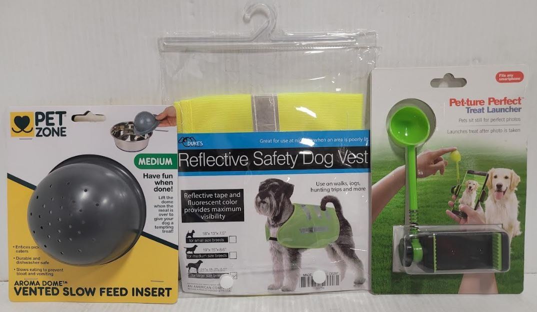 PET ZONE MEDIUM AROMA DOME VENTED SLOW FEED INSERT, PET-TURE PERFECT TREAT LAUNCHER, & DUKES PET PRODUCTS REFLECTIVE SAFETY DOG VEST FOR MEDIUM-LARGE SIZE BREEDS 21" X 15.7" X 9.5" - ALL NEW SEALED