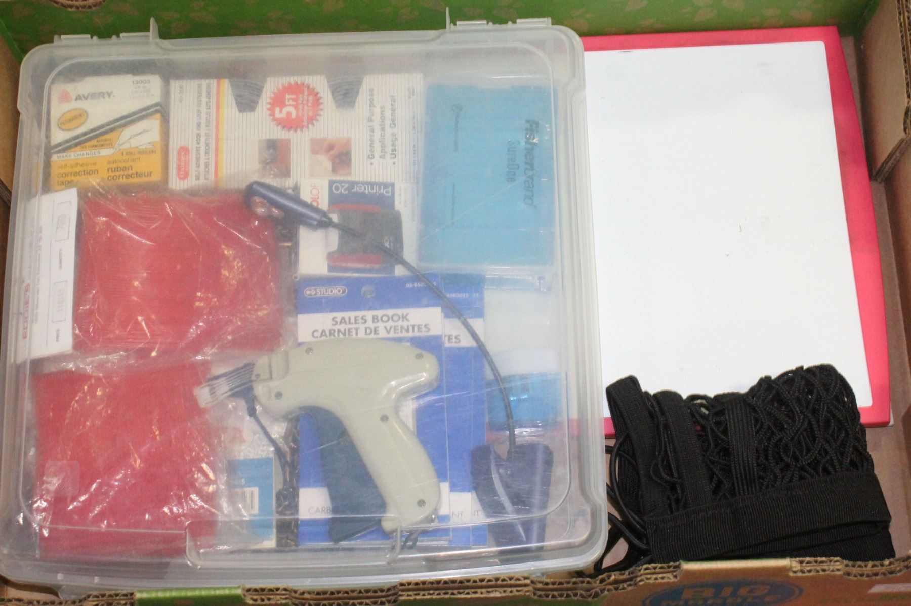 PRICEW TAGGING GUN + EXTRA NEW TAGS, FRAMED WHITE BOARD, CLEAR PLASTIC CARRYING CASE, NEW MESH VEHICLE ORGANIZER, CARD HOLDER, NEW SALES BOOKS, READING LIGHT(TESTED), NEW CORRECTION TAPE, NEW SELF ADHESIVE VELCRO, NEW "EXCHANGE OR STORECREDIT ONLY" STAMP, + MORE **ALL ITEMS MUST BE REMOVED BY 5PM FRIDAY, AUGUST 12TH, 2022. ALL REMAINING ITEMS WILL BE SUBJECT TO A $6.00 PER DAY STORAGE CHARGE. ANY ITEMS REMAINING AFTER FRIDAY, SEPTEMBER 2, 2022 WILL BE CONSIDERED FORFEITED. NO REFUNDS WILL BE ISSUED FOR FORFEITED ITEMS.** TO SCHEDULE A PICK UP APPOINTMENT. CLICK HERE