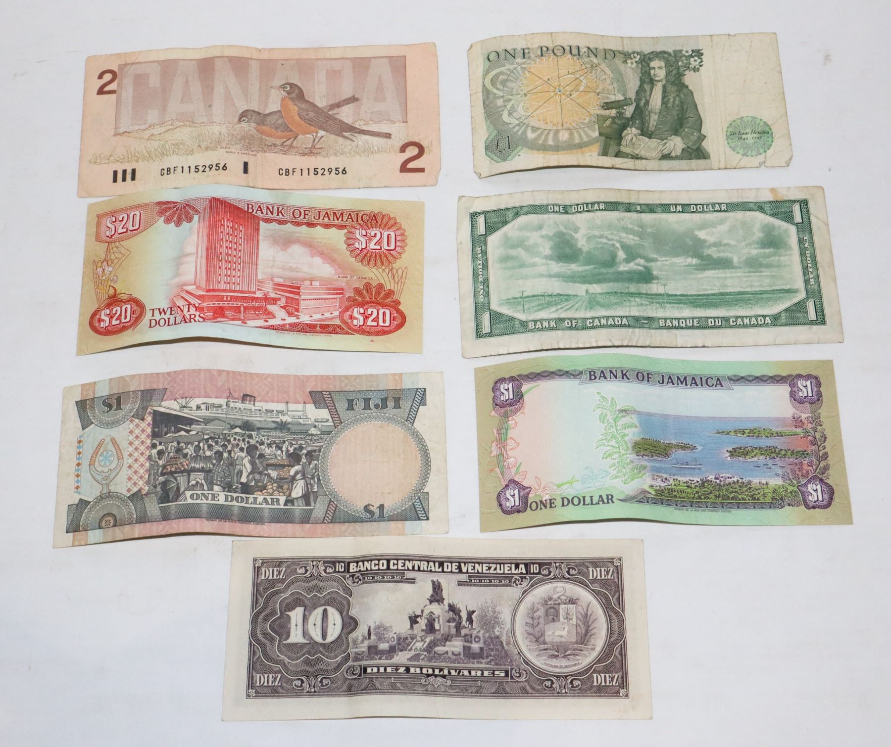 1951 ONE DOLLAR BANK NOTE, 1986 CANADIAN TWO DOLLAR BANK NOTE, AND SOME WORLD CURRENCY