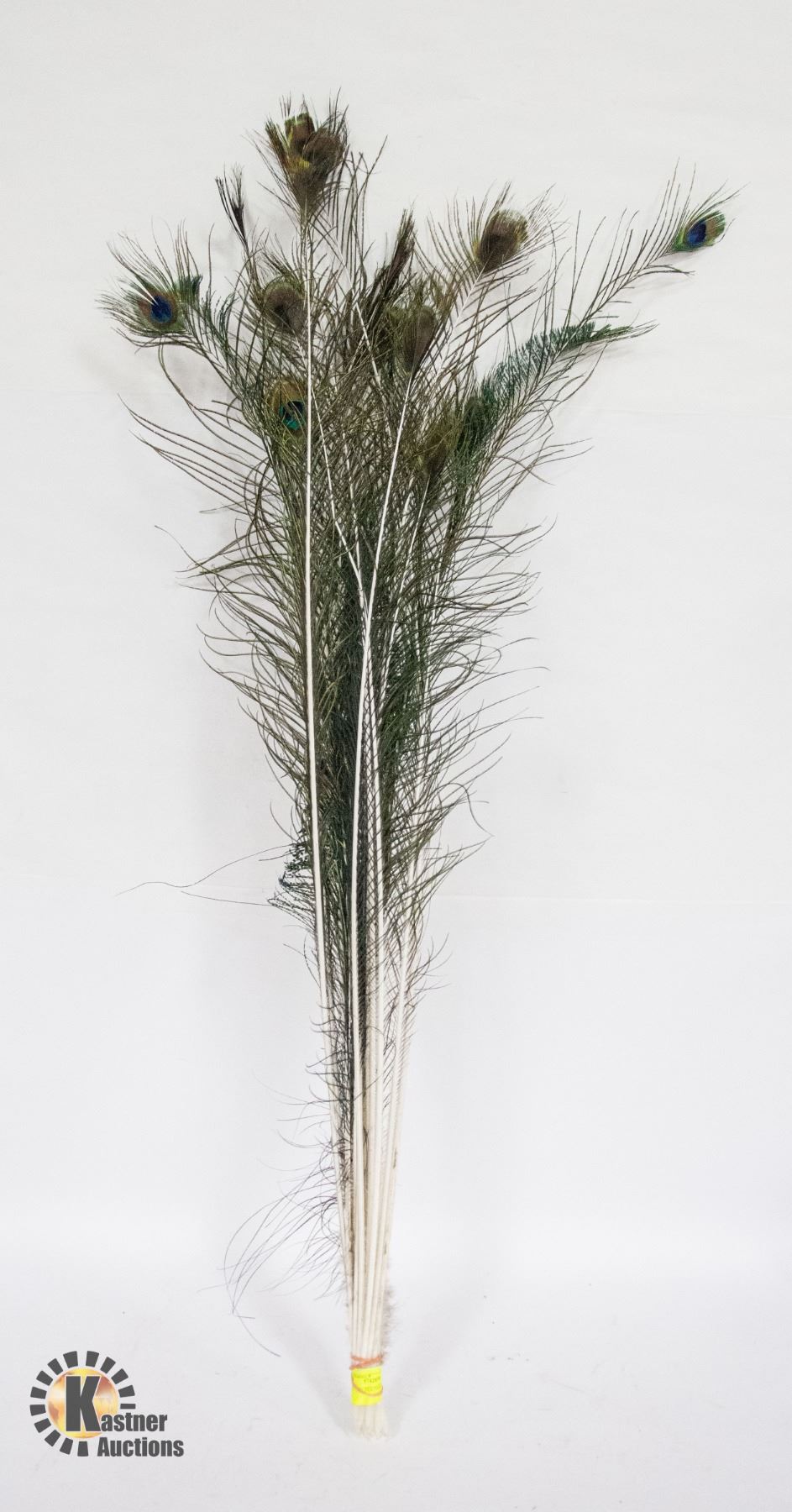 APPROX 20 PEACOCK TRAIN FEATHERS **ALL ITEMS MUST BE REMOVED BY 5PM SATURDAY, JANUARY 6TH 2023. ALL REMAINING ITEMS WILL BE SUBJECT TO A $6.00 PER DAY STORAGE CHARGE. ANY ITEMS REMAINING AFTER MONDAY, JANUARY 22ND, 2023 WILL BE CONSIDERED FORFEITED. NO REFUNDS WILL BE ISSUED FOR FORFEITED ITEMS. TO SCHEDULE A PICK UP APPOINTMENT CLICK HERE