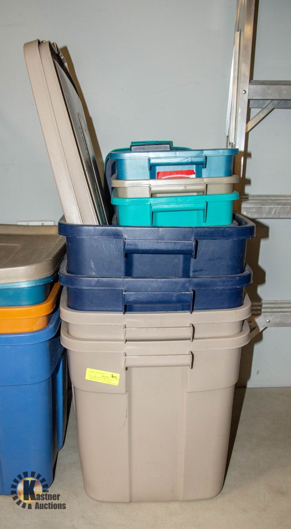 LIDS INCL. TWO 68 LITER WITH LIDS, ONE 34 LITER, ONE 28 LITER, FIVE 11 LITER TOTES WITH 2 LIDS (TOTAL OF 9 TOTES - 4 LIDS) **ALL ITEMS MUST BE REMOVED BY 5PM SATURDAY, DECEMBER 7TH 2024. ALL REMAINING ITEMS WILL BE SUBJECT TO A $6.00 PER DAY STORAGE CHARGE. ANY ITEMS REMAINING AFTER MONDAY, DECEMBER 23RD 2024 WILL BE CONSIDERED FORFEITED. NO REFUNDS WILL BE ISSUED FOR FORFEITED ITEMS. TO SCHEDULE A PICK UP APPOINTMENT CLICK HERE