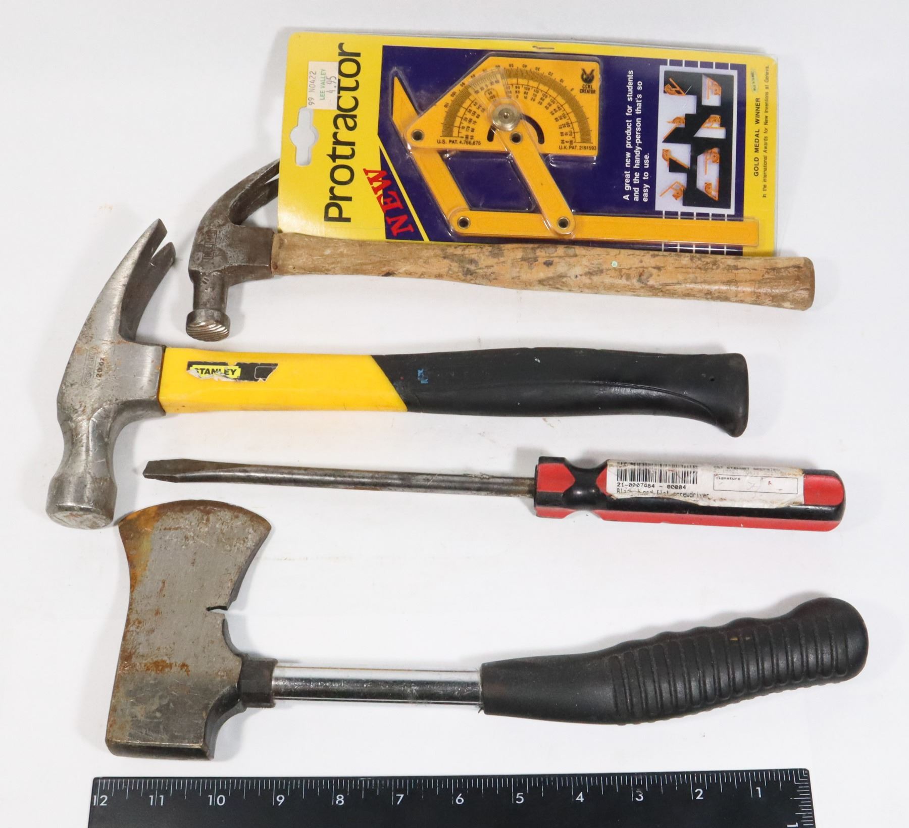 BUNDLE OF TOOLS INCLUDING HATCHET, HAMMERS,