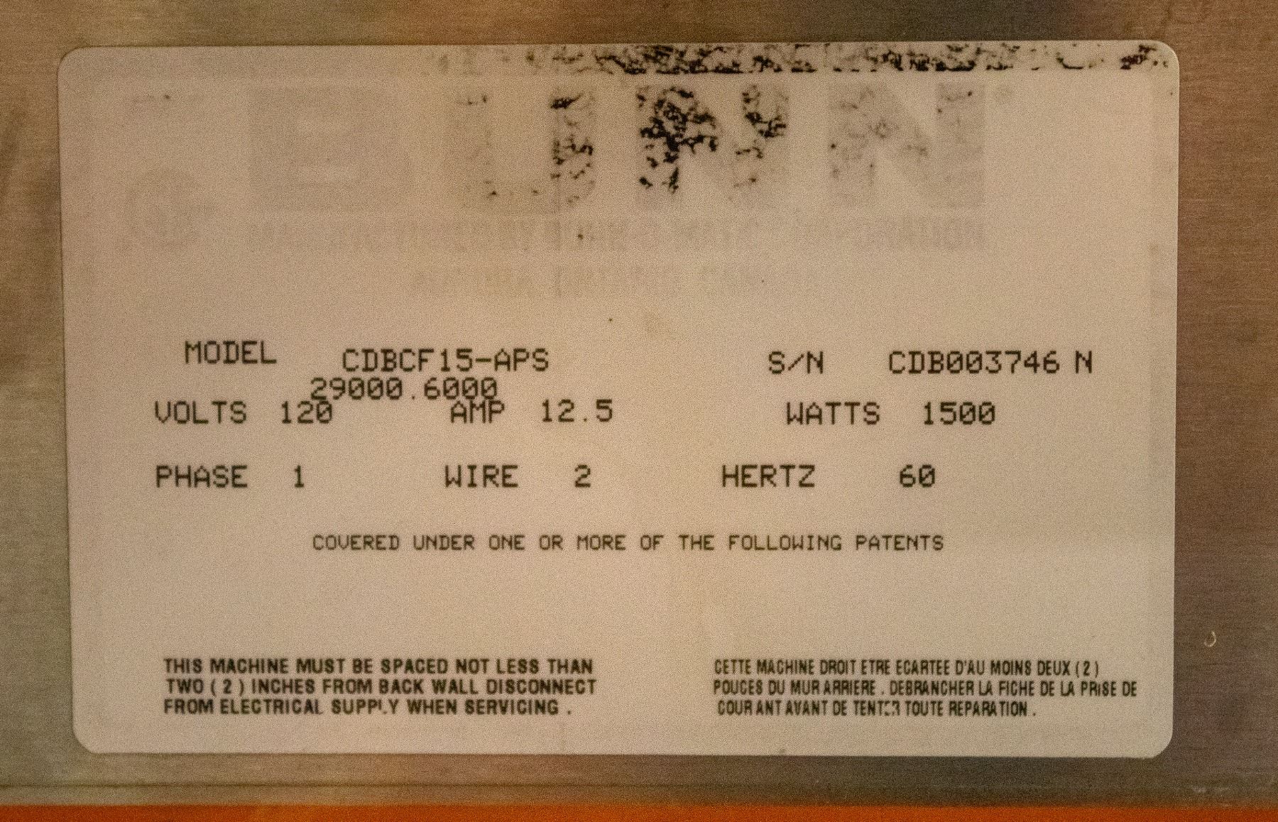 MODEL # CDBCF15-APS, 120 VOLTS, 12.5 AMPS, 1500 WATTS, PHASE 1, 2 WIRES, 60 HZ, 18" X 8" X 24"