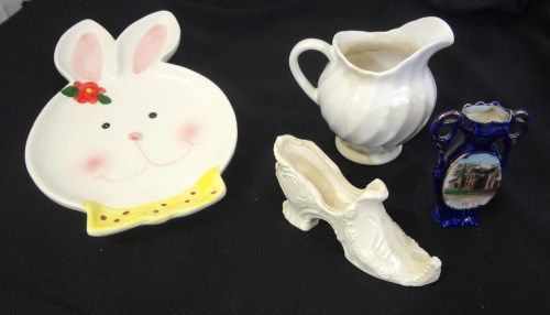 BUNNY PLATE, CREAM COLORED CREAMER, CERAMIC SHOE AND MINI VASE