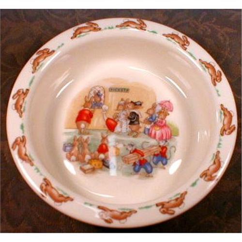 <p>This bowl shows the Bunnykins at the railroad station. Some