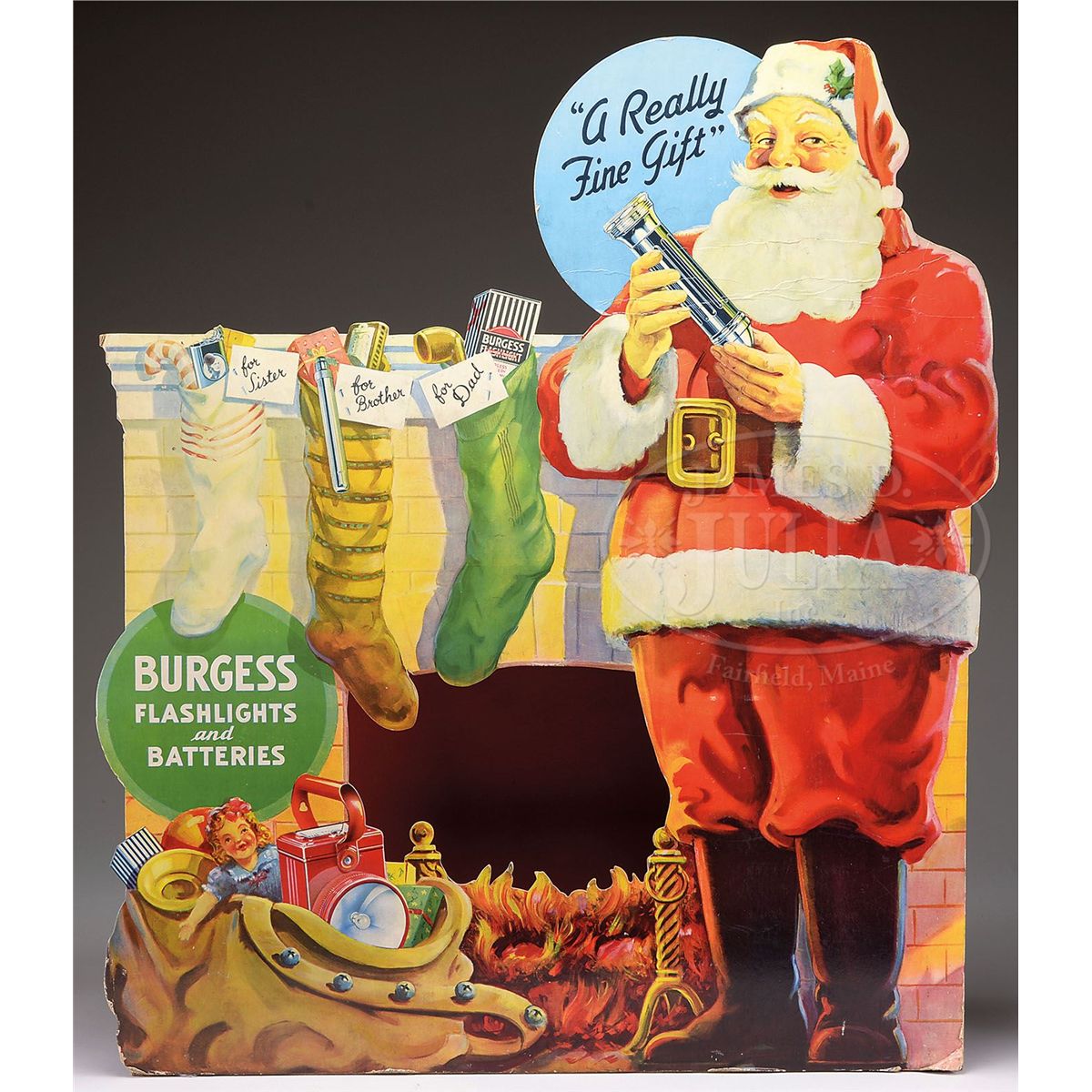 Large easel-backed die-cut cardboard window display of Santa Claus filling Christmas stockings full of Burgess flashlights and batteries. Display has a hinged rear section which unfolds to give the fireplace a 3-D effect. Meisenheimer Printing Co., Milwaukee, Wis. SIZE: 34" t x 40" w. CONDITION: Good to very good; creases across Santa's beard and some minor edge chips. 1-13206