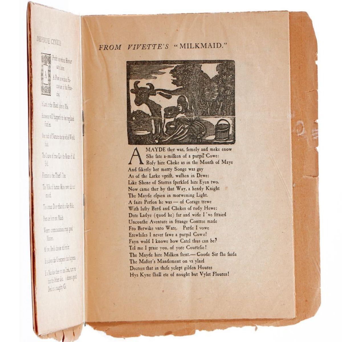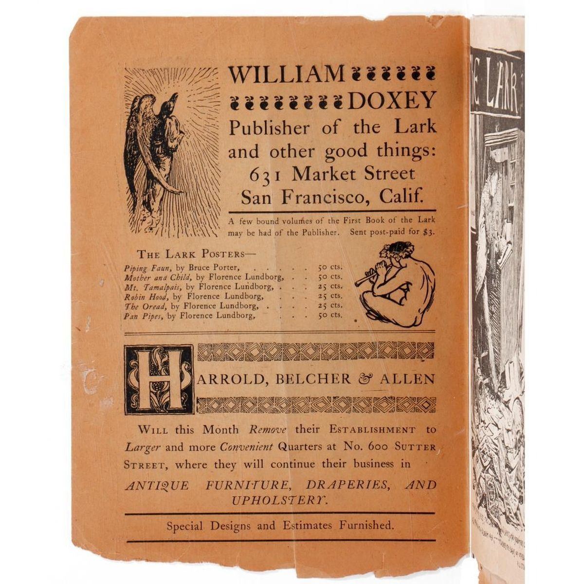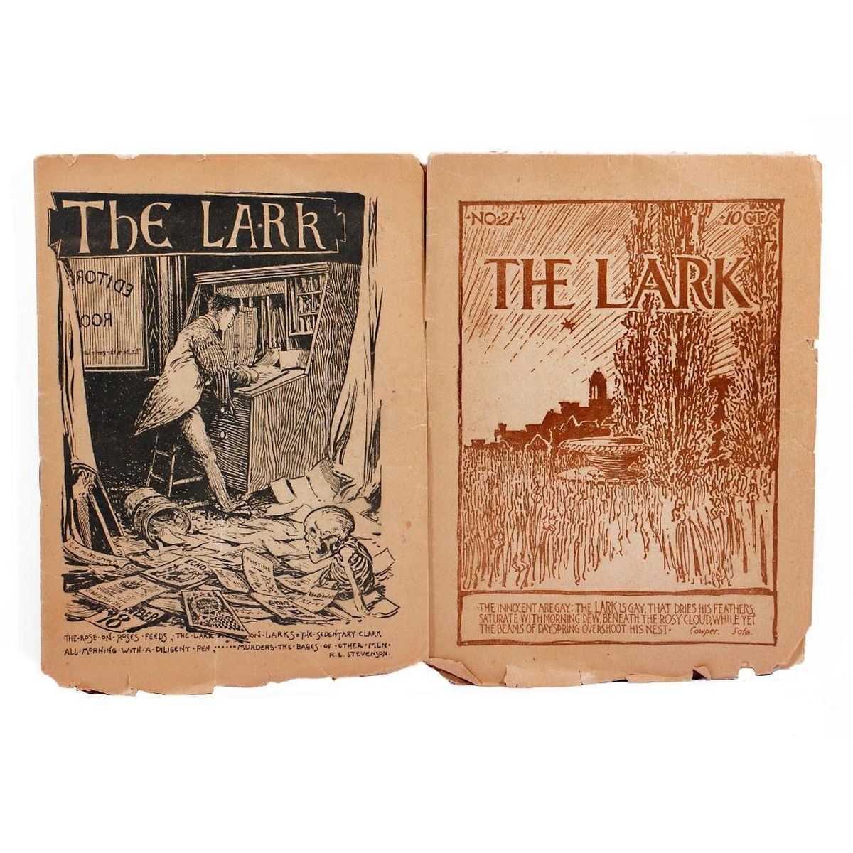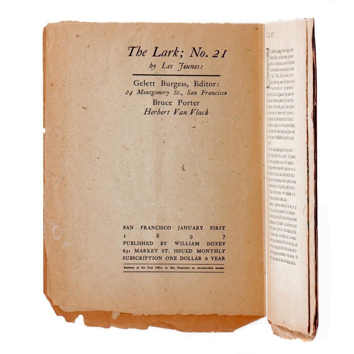 Two editions of The Lark magazine, stapled 8vo booklets published by William Doxey, San Francisco: 1. Edition No. 18. October 1, 1896. Publisher ads inside of pictorial paper wrappers. 14 leaves, some partially cut. By "Les Jeunes": Ernest Peixotto, Bruce Porter, Carolyn Wells, Juliet Wilbur Tompkins, Arthur Atkins. Condition: A slight fold down the middle; chips/tears to edges of covers; tears to bottom of some pages; toned. 2. Edition No. 21. January 1, 1897. Publisher ads inside of pictorial paper wrappers. 13 leaves, some partially cut. By "Les Jeunes": Bruce Porter, Herbert Van Vlack. Condition: Tears to edges of covers; chips/tears to bottom of some pages; toned.