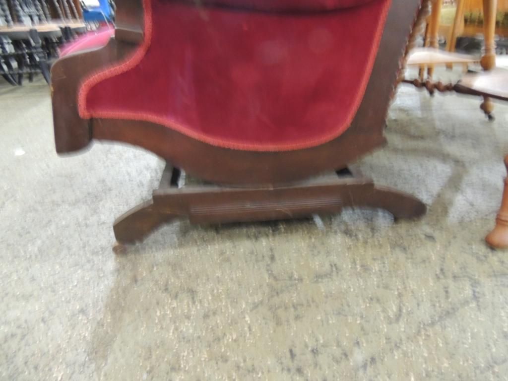 TUFFED DETAIL CARVED WOOD DETAILS. VINTAGE PARLOR CHAIR ROCKING CHAIR. AS SHOWN. SEE PHOTO FOR MORE DETAILS.