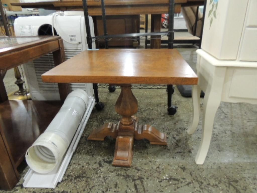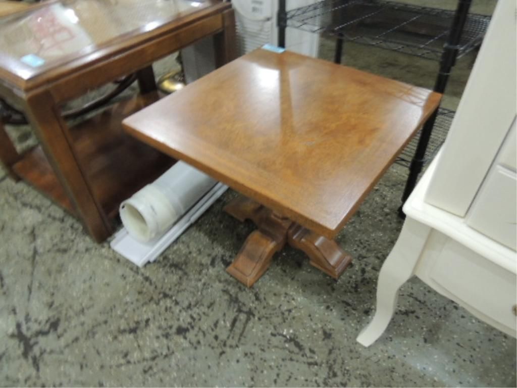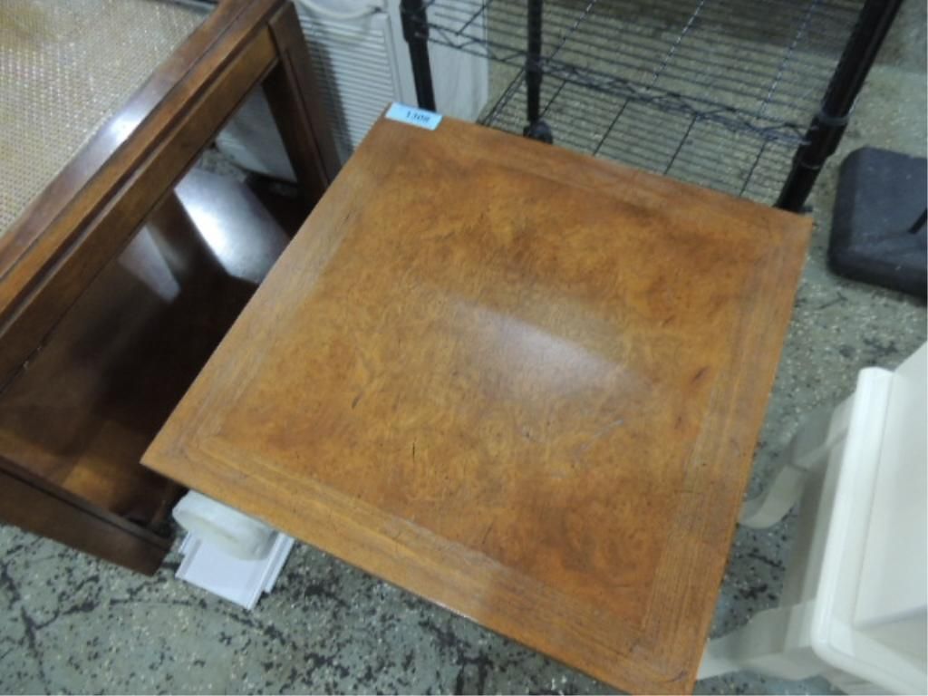 CONTEMPORY END TABLE BURL BURLD WALNUT TOP OCCASIONAL TABLE. 20X20 17" HIGH. AS SHOWN SEE PHOTOS FOR DETAILS.