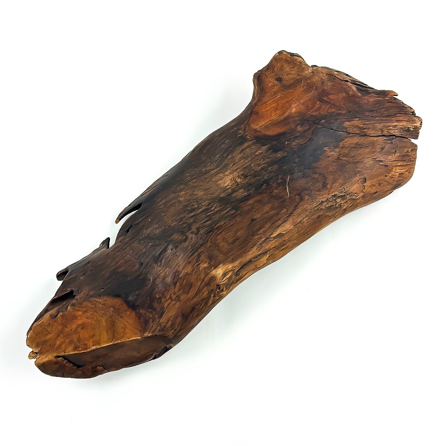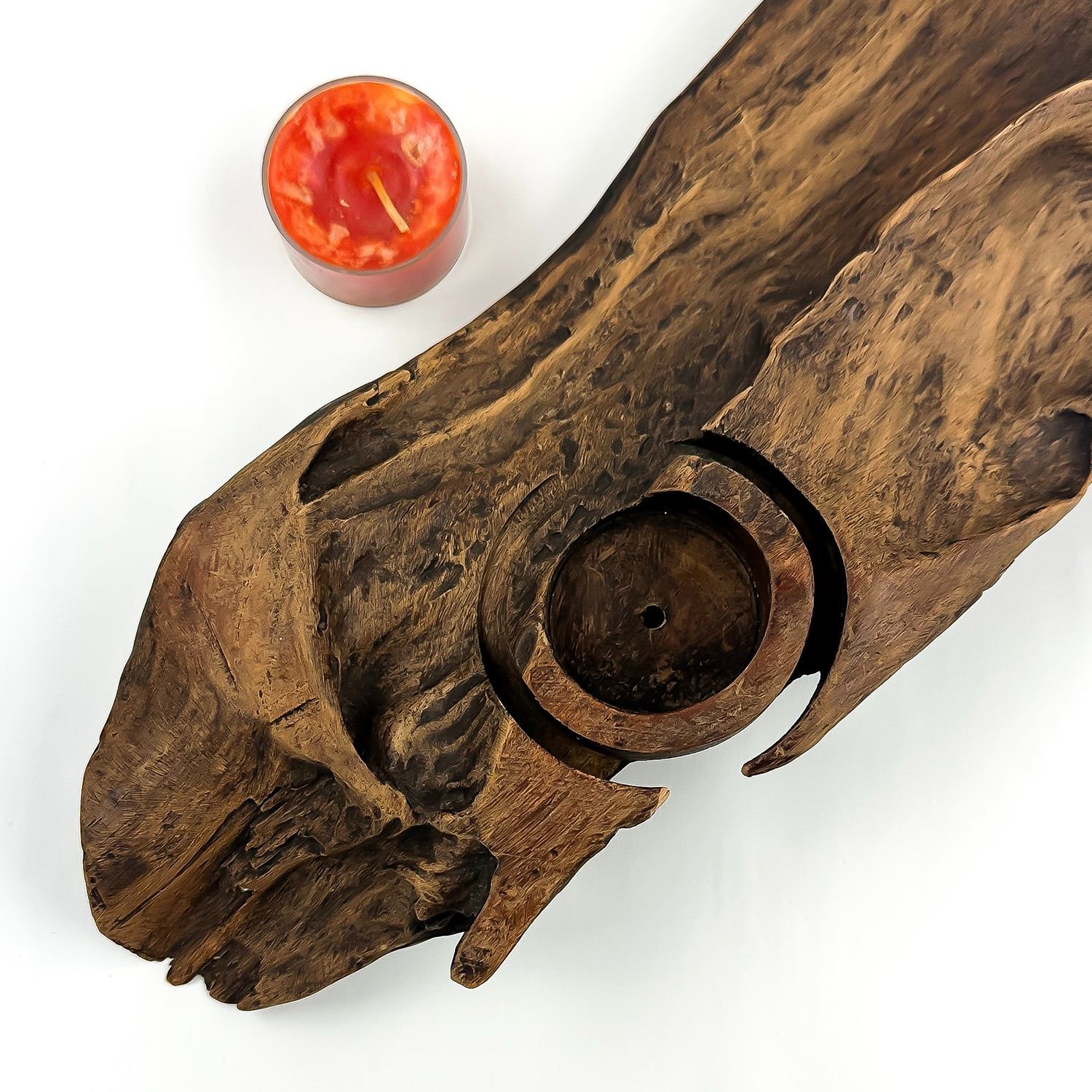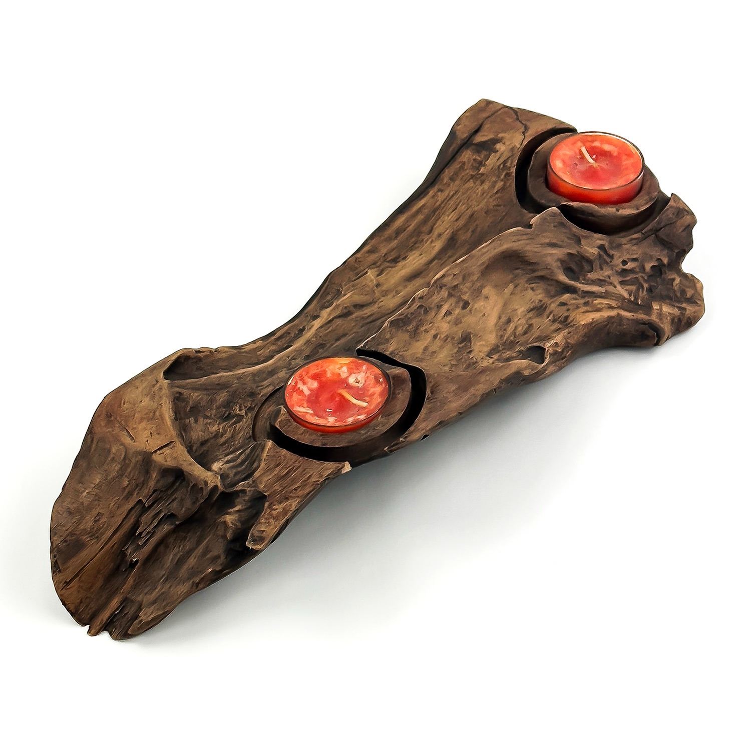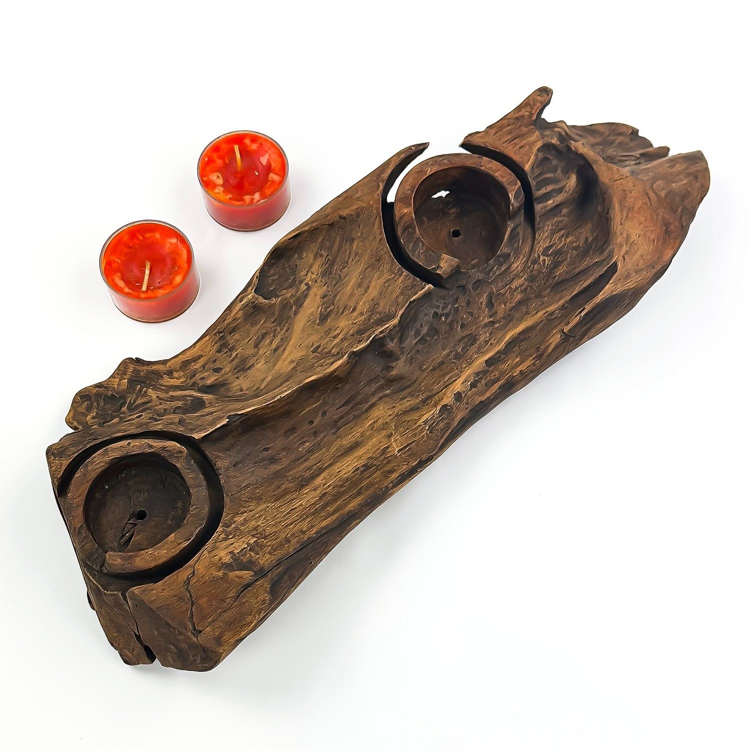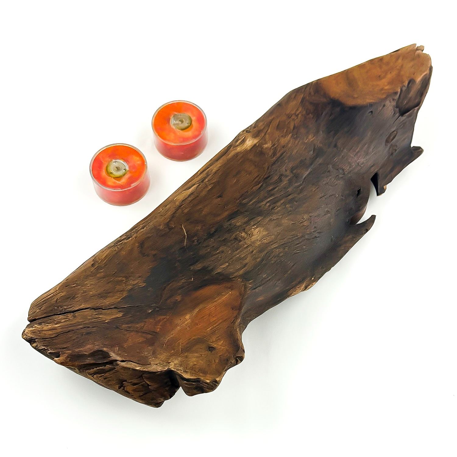 #8061 - VINTAGE UNIQUE HAND CRAFTED WOODEN TEA LIGHT CANDLE HOLDER - BURL WOOD SCULPTURE. HOLDS REGULAR SIZE TEA LIGHT CANDLES. MEASURES: 13” (33 CM) LONG BY 5.5” (14 CM) AT WIDEST PART AND SITS ROUGHLY 1.5” (4 CM) HIGH