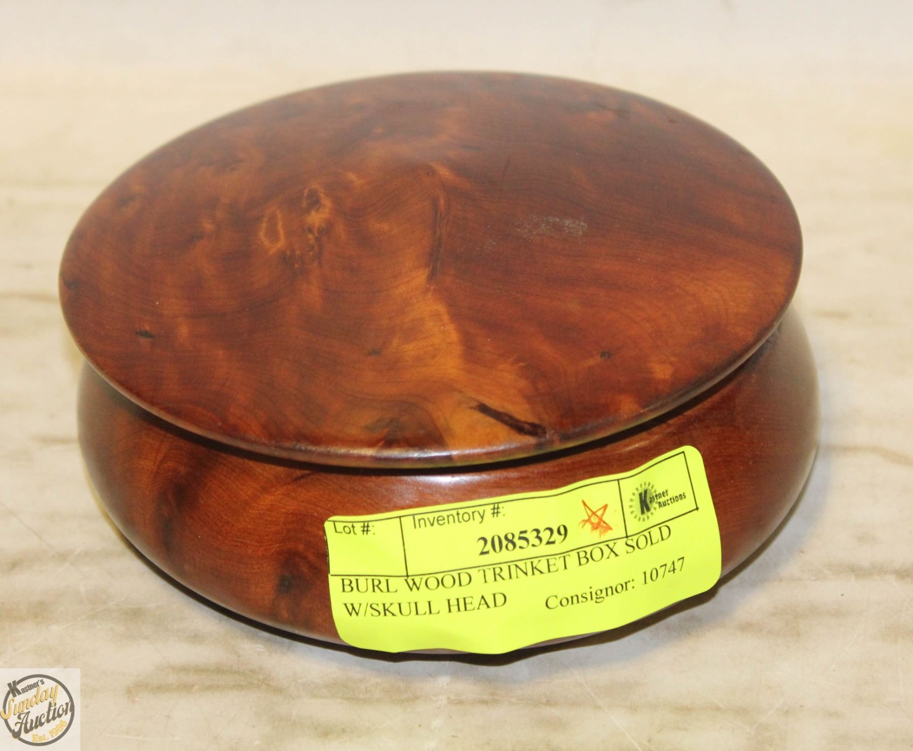 BURL WOOD TRINKET BOX SOLD W/SKULL HEAD