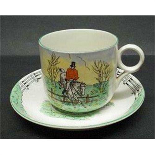 GORGEOUS ENGLISH STYLE "HUNTING MORNING CUP", CONSISTING OF MUG AND SAUCER.HAND PAINTED DEPICTING BEAUTIFUL HUNTING SCENE AND ON THE BACK OF THE MUG, RIDING CROP,HORN AND HORSE SHOE, AND SAUCER IS A BEUATY!, PLEASE see the images - Excellent condition, free from chips or cracks, Mug stands about 3 3/4" high and 4" in diam., Saucer measures about 7 1/2" in diam., US Buyer to pay 9.00 for shipping plus insurance.THANKS.