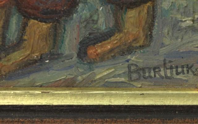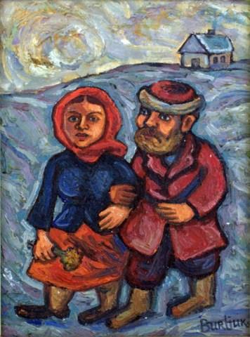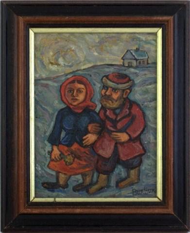 David Davidovich Burliuk (Russian/American 1882-1967) depicts man and woman couple walking. The woman is holding flowers and a house can be seen in the background. Signed lower right. Measures 7 3/4" h X 5 3/4" w + 1 1/4" matte and frame. Burliuk was born in Russia and studied at the Art School Kasan in Odessa, as well as the Royal Academy in Munich and the Moscow School for Painting, Sculpture and Architecture. In 1911 Burliuk exhibited with the famous Blue Rider group in Munich. Known also as a Neo-Primitivist, he is mainly associated with Russian Futurism and co-authored the Russian Futurist manifesto A Slap in the Face of Public Taste. Burliuk immigrated to the United States between the world wars and lived there until his death.