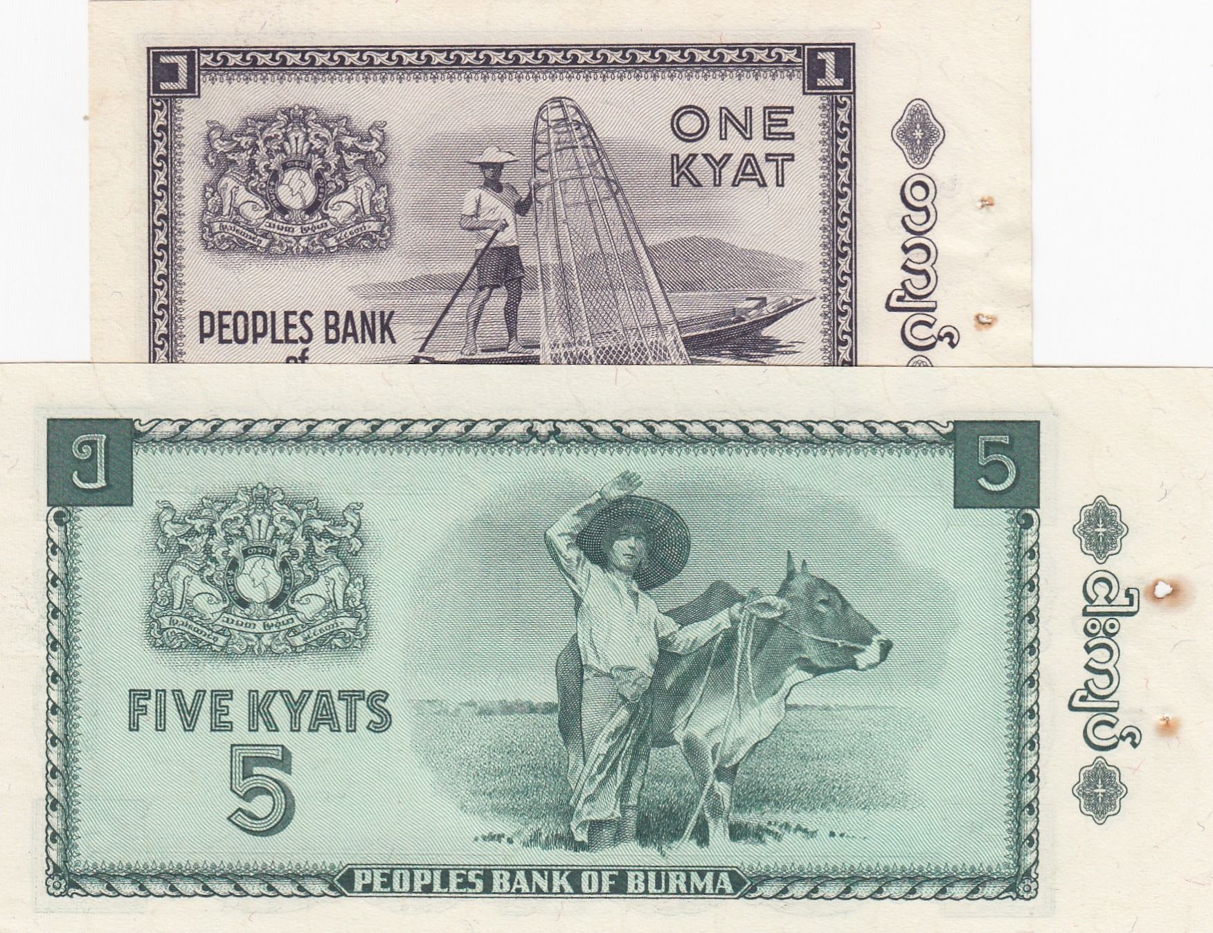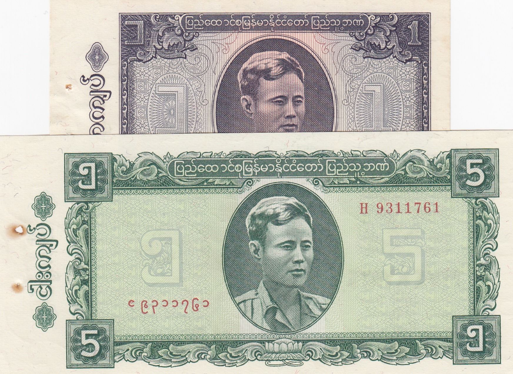 Burma, 1 Kyat and 5 Kyats, 1965, UNC, p52/ p53, (Total 2 Banknotes)