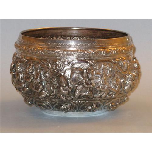 </font></strong>This is a beautifully designed, meticulously hand crafted and Highly Repoussed Burmese Water Purification Bowl from the early 1800's. Masterfully hand wrought and crafted in an array of Mongul Warlords in various positions surrounding the entire surface of this Elegant piece. The bowl features Ancient Warriors, Horses, and Mythical characters in various positions in Exceptionally High Relief, set upon a lavish, highly ornamented with the finest hand hammered, stipple background, decorated throughout. The Exquisite figures cover nearly every centimeter of the body. The background surface accentuates the figures perfectly. Rich, lustrous silver patina. Retains its original crisp, vibrant hand chased detail throughout. This Rare and exceptionally beautiful piece is in next to pristine condition with no dings, dents, breaks, bends or distortion. Measures 8 1/4 inches in diameter x 4 inches in height.