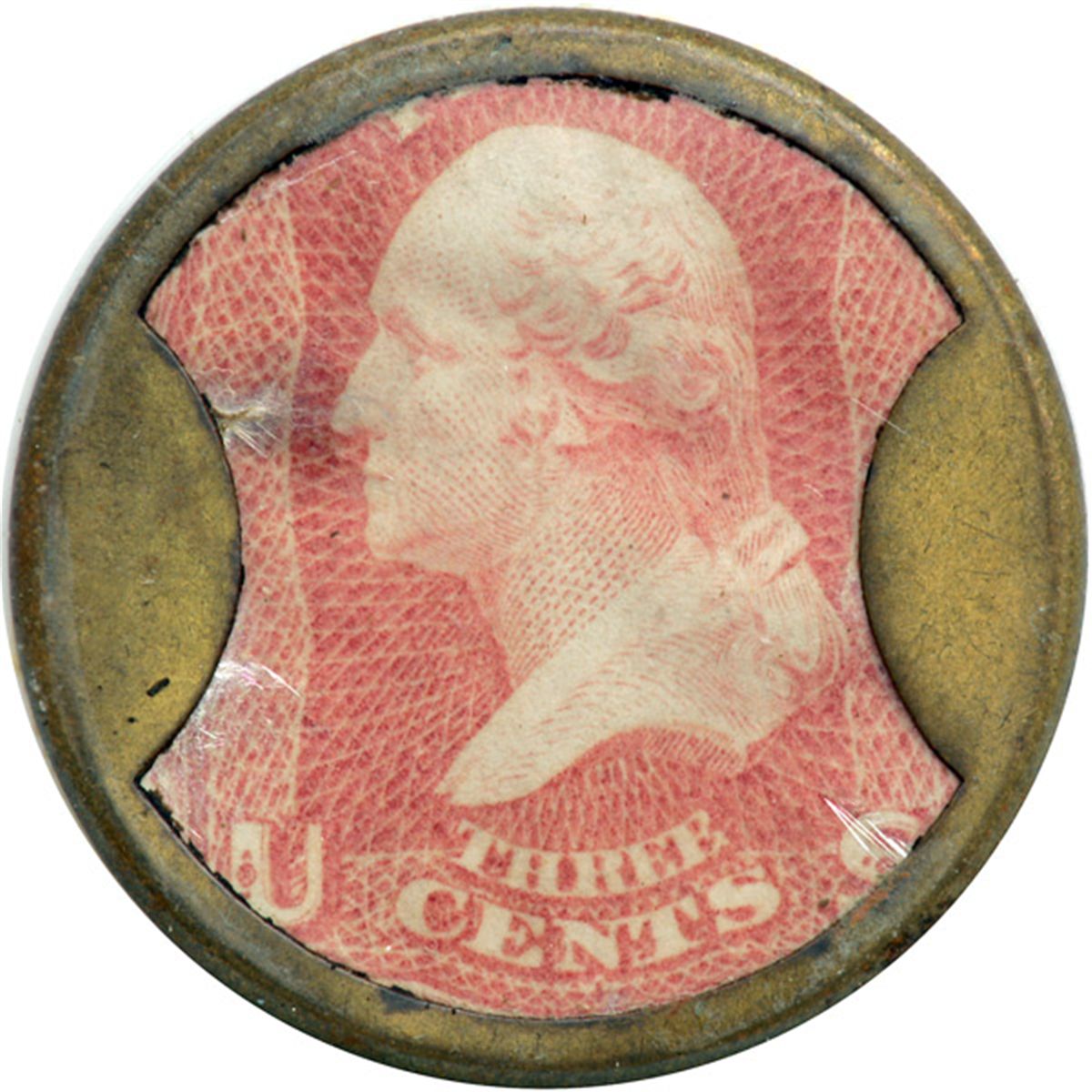 "BURNETT'S COCOAINE KALLISTON" EP-39, HB-74, S-45 3¢. . Fr-EP-39. The case appears original and unopened, and displays an attractive light brown and tan appearance. The mica displays some isolated crazing, particularly near the left tab. The stamp is slightly wrinkled but retains good color and brightness. Extremely Fine.