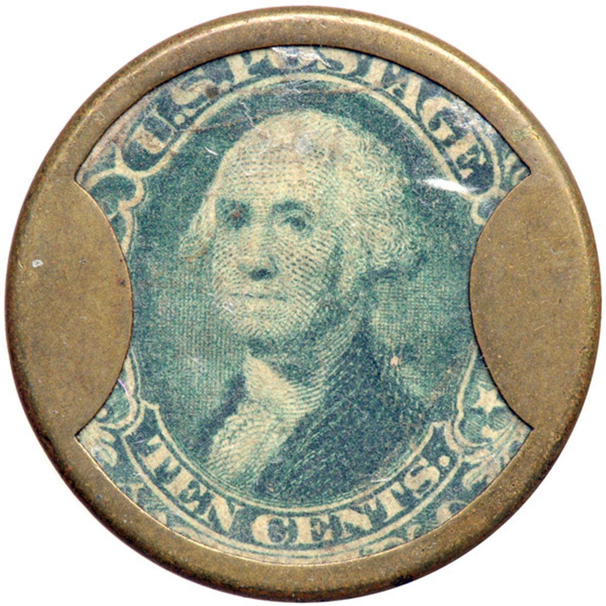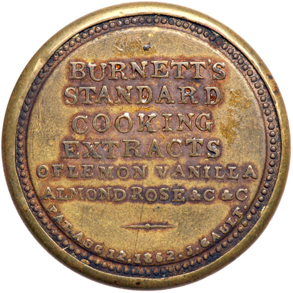 "BURNETT'S STANDARD COOKING EXTRACTS" EP-106, HB-84, S-55, 10¢ Plain frame. . Fr-EP-106. A glossy brown case gives this piece excellent eye appeal, and it appears unopened and free of any tampering or cleaning. The reverse is rotated about 30 degrees. About a third of the mica displays moderate crazing, but it is free of any major problems save for a short crack near the top rim. The stamp is well centered but lacking in brightness. It is accompanied by a Philatelic Foundation certificate (#435610) indicating it to be genuine. Choice Very Fine.
