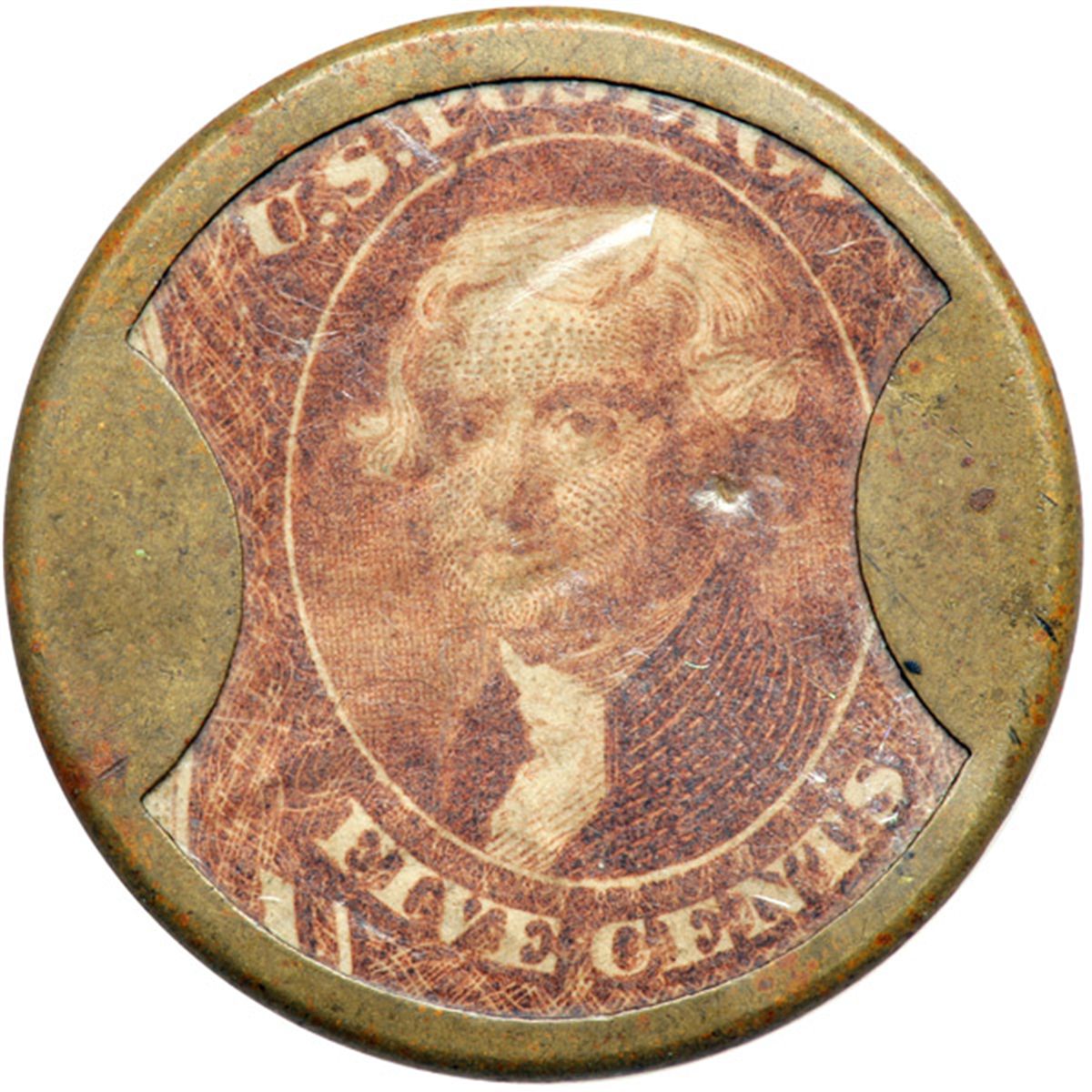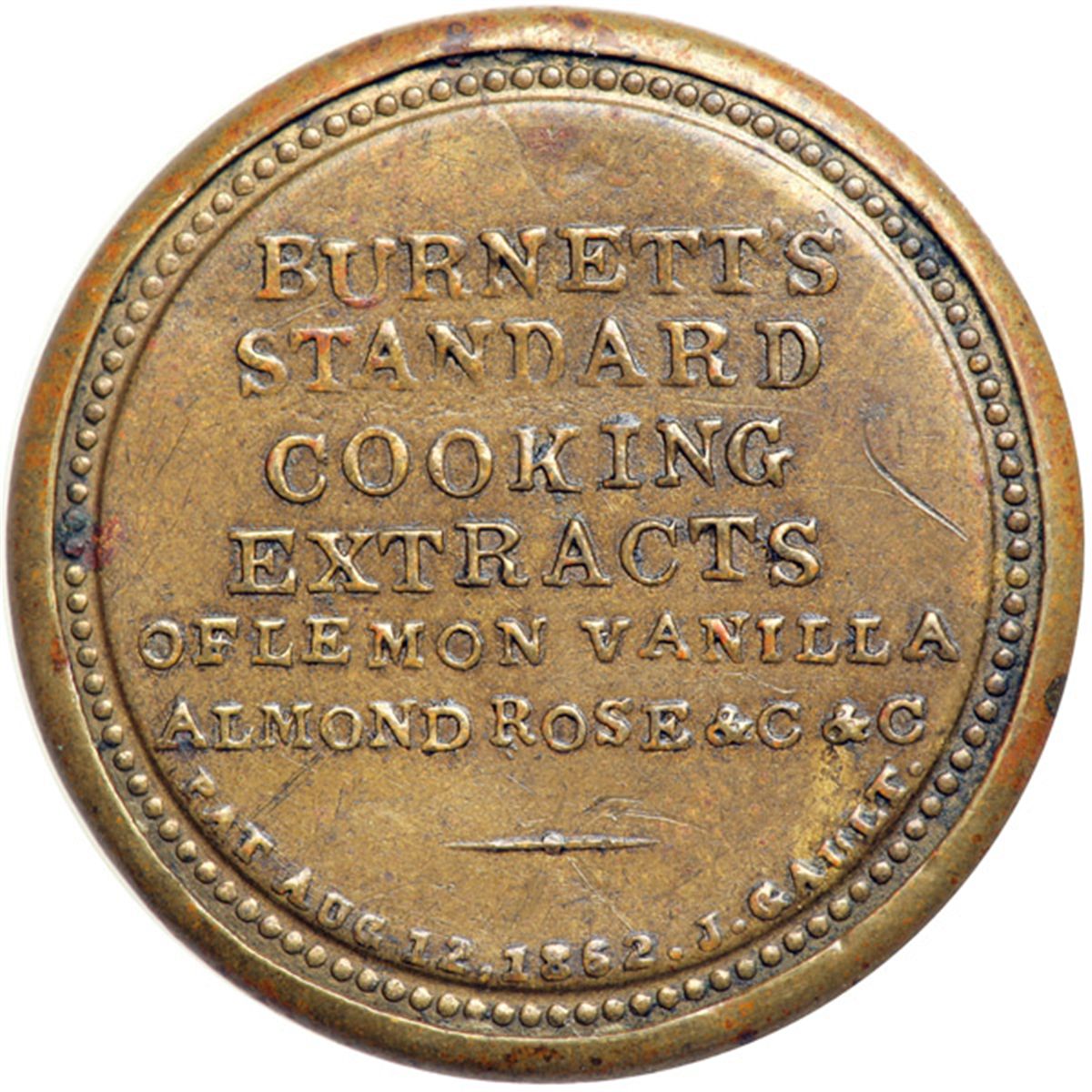 "BURNETT'S STANDARD COOKING EXTRACTS" EP-70, HB-83, S-54 5¢. . Fr-EP-70. This is a common enough piece, but the overall condition is above average. The case is original and unopened with lovely glossy-brown surfaces. The mica is about 85% clear, with a streak of crazing diagonally across the center and a light vertical scratch the only major flaws. The stamp is off center but retains excellent color and brightness. Extremely Fine.