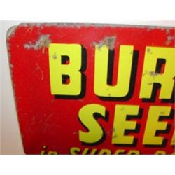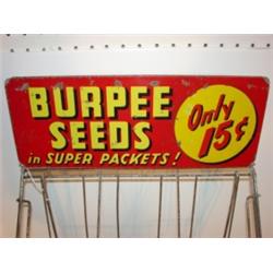 BURPEE SEEDS ADVERTISING STORE DISPLAY RACK. Top of rack reads "Burpee Seeds in super packets-Only 15ó". 3 tiered rack. Sign on top of rack shows loss to paint and minor rusting. Rack shows signs of rusting. 19" H, 14.5" W