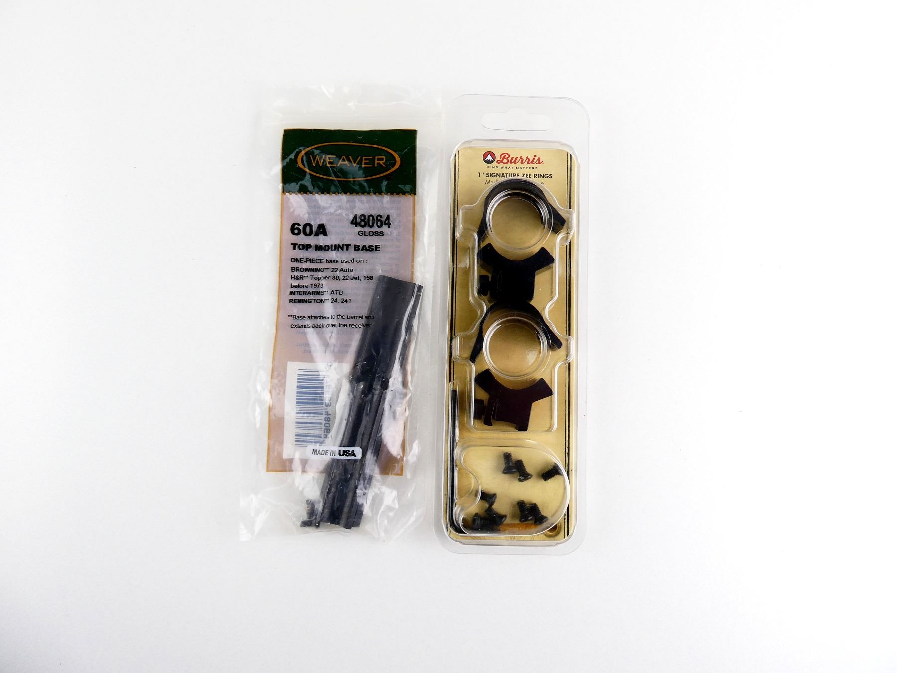 LOT INCLUDES; (1) SET OF BURRIS 1" SIGNATURE ZEE SCOPE RINGS, BLACK STEEL, MEDIUM, PART #: 420520, APPEARS NOS IN ORIGINAL PACKAGING, MAY NOT BE COMPLETE & (1) SET OF WEAVER SCOPE 60A TOP MOUNT BASE, BLACK STEEL, PART #: 48064, WITH ORIGINAL PACKAGING, MAY NOT BE COMPLETE. MAY REQUIRE FITTING. SEE PHOTOS.