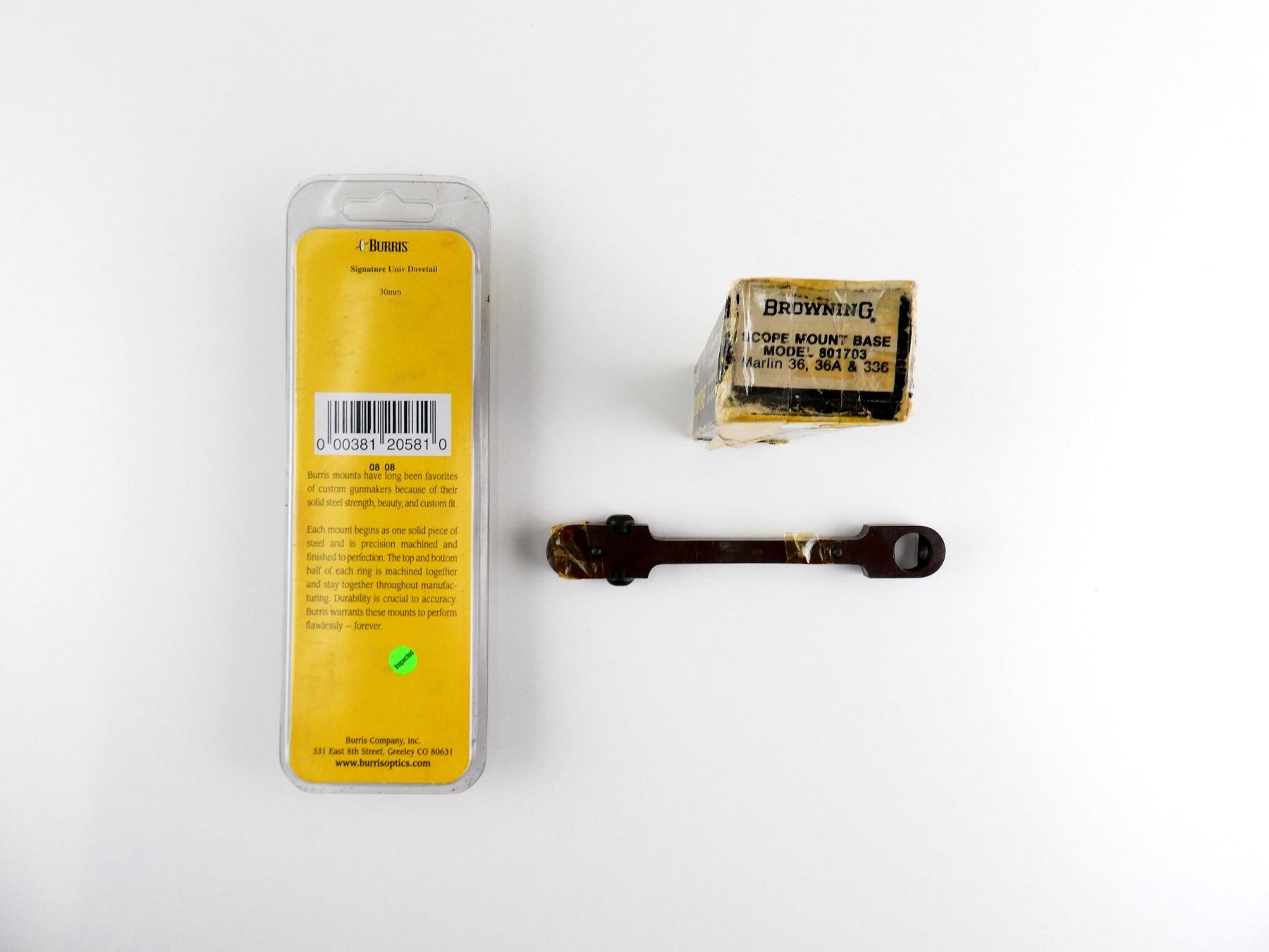 LOT INCLUDES; (1) SET OF BURRIS 30MM DOVETAIL SCOPE RINGS, BLACK MATTE STEEL, PART #: 420581, APPEARS NOS IN ORIGINAL PACKAGING, MAY NOT BE COMPLETE & (1) SET OF BROWNING MARLIN 36 / 36A / 336 SCOPE MOUNT BASES, BLACK STEEL, PART #: 801703, APPEARS NOS IN ORIGINAL PACKAGING, MAY NOT BE COMPLETE. MAY REQUIRE FITTING. SEE PHOTOS.