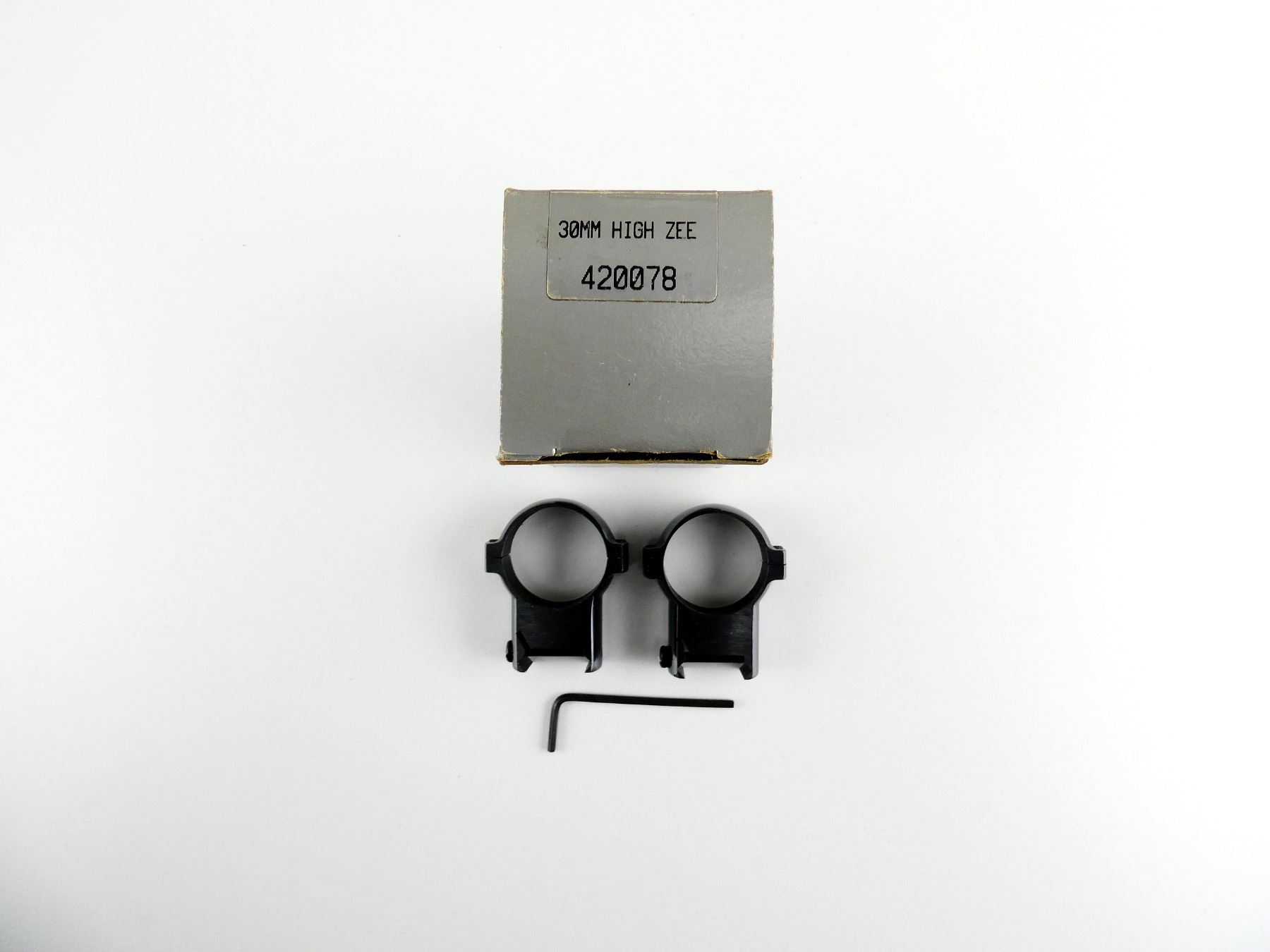 LOT INCLUDES; (1) PAIR OF 30MM RINGS, BLACK STEEL, PART #: 420078, NOS IN ORIGINAL PACKAGING, MAY NOT BE COMPLETE. MAY REQUIRE FITTING. SEE PHOTOS.