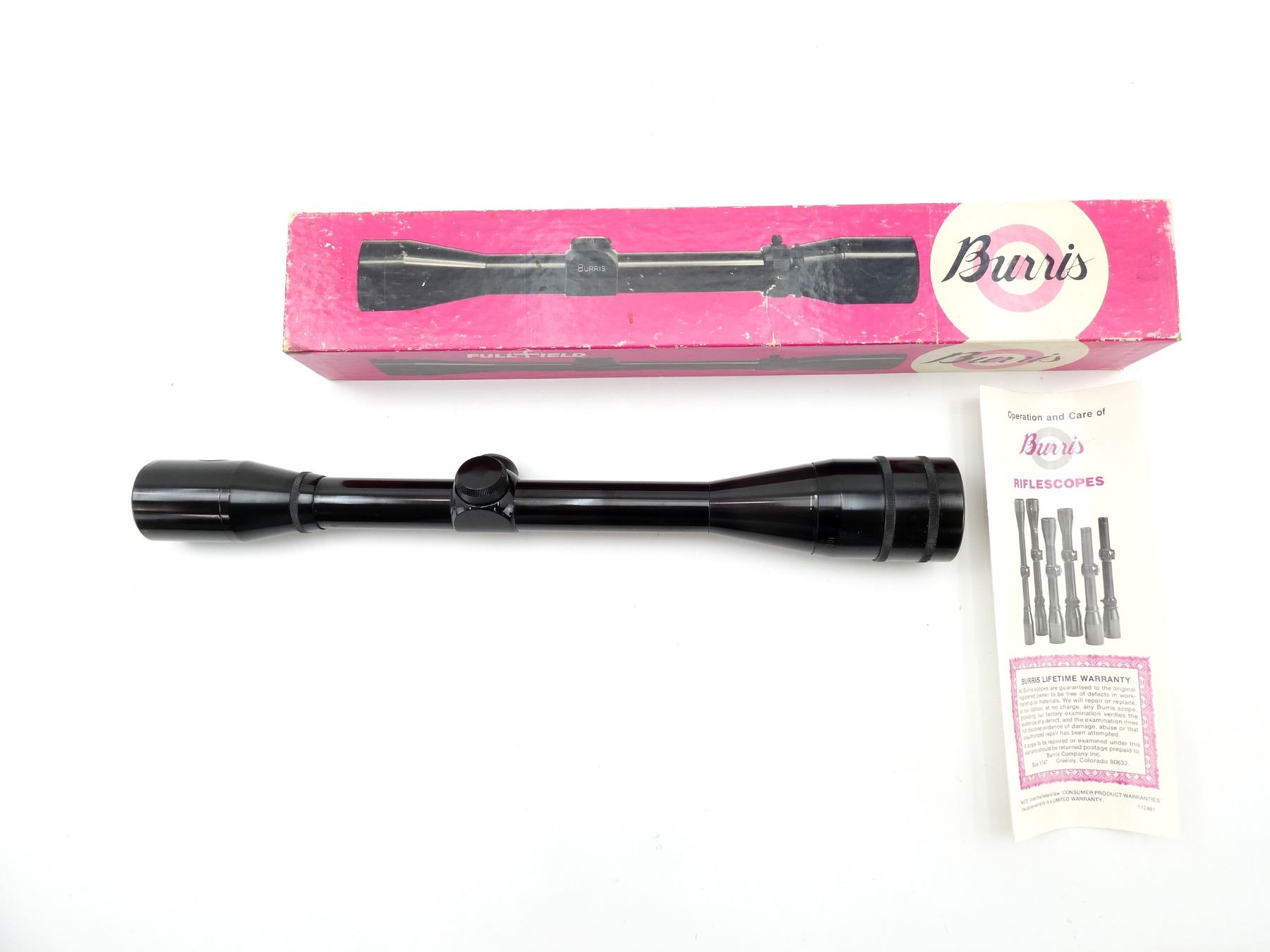 (1) CLEAR OPTICS, FINE CROSS HAIR RETICLE, 1" TUBE DIAMETER, WORKING MAGNIFICATION RING, WINDAGE & ELEVATION KNOBS TURN, MARKED: "10X, BURRIS", ETC., WITH INSTRUCTIONS & ORIGINAL PACKAGING, SHOWS WEAR & TEAR / USE MARKINGS. MAY REQUIRE FITTING. SEE PHOTOS.