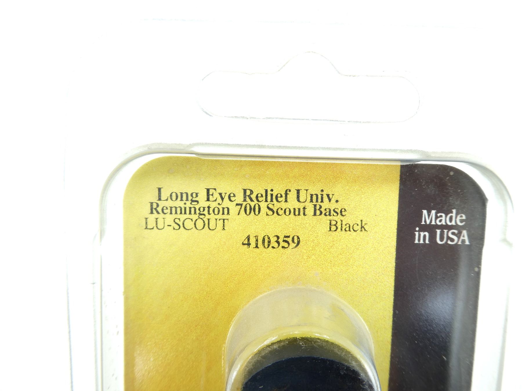 (1) SCOPE BASE MOUNT, PACKAGE MARKED: "LONG EYE RELIEF UNIV., REMINGTON 700 SCOUT BASE, LU-SCOUT, BLACK, 410359", APPEARS NOS, IN ORIGINAL PACKAGING. SEE PHOTOS.