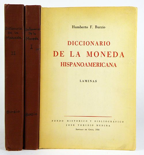 Burzio, Humberto F. DICCIONARIO DE LA MONEDA HISPANOAMERICANA. Santiago de Chile, 1956-1958. Three volumes, complete. 4to, text volumes in maroon cloth, gilt; laminas in original printed card covers. xix, (1), 327, (3); 453, (5); (6) pages; 116 plates. Near fine. A very useful work. Clain-Stefanelli 11462*: "an exhaustive study of the Spanish-American coinage conveniently arranged in alphabetical order by entries." Ferrari * 13: "Se trata de una obra fundamental que constituye, excediendo su carácter de nomenclator, un verdadero inventario del estado de la numismática hispanoamericana el momento de su aparición." Grierson 213: "un ouvrage de référence essentiel." Text volumes ex Léo Meloche.