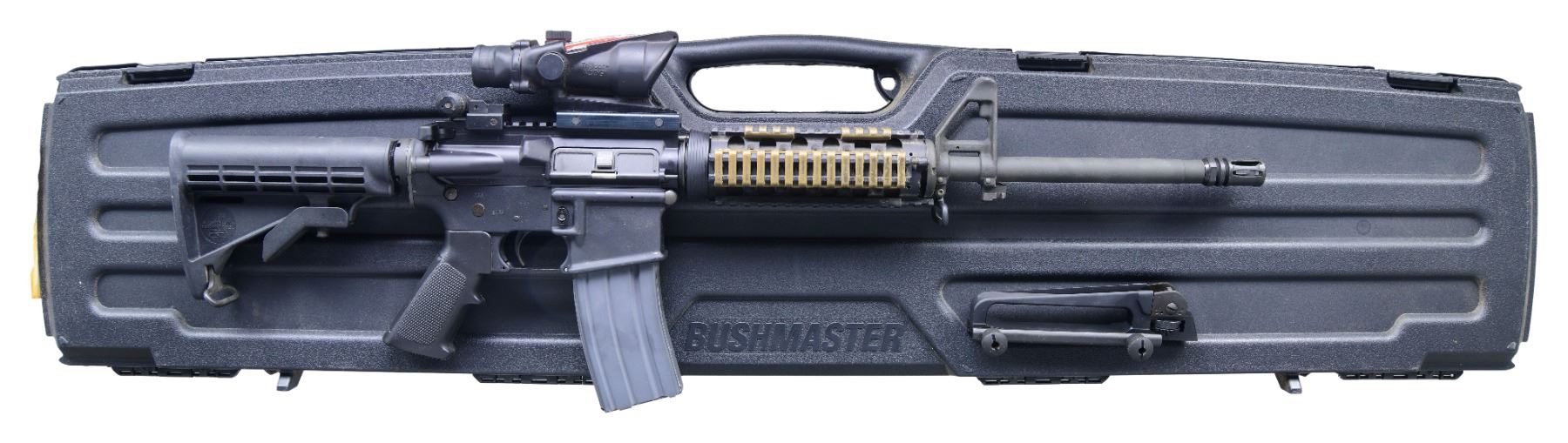 Please note as of 4/9/25 this item description has been updated. Please revisit this description and contact us with any questions. Cal. 5.56 NATO. S# BFI499842. Bbl. 16". A Windham, Maine Bushmaster, Model XM15-E2S. Heavy barrel, w/ threaded muzzle, terminated w/ A2 muzzle brake. Barrel marked; "B MP 5.56 NATO 1/9 HBAR". 6.5" quad rail forend, currently sporting ladder rail covers, retained w/ tapered delta ring. Protected post front sight. Flat top upper receiver w/ round forward assist & brass deflector, currently sporting Trijicon ACOG marked "ACOG 4x32 JN 8:12". Red, illuminated circle w/ range tab reticle. 6 position, collapsible shoulder stock. Sling swivels front & rear. SP1 profile bolt carrier. MAGS: 1 BFI aluminum 30 rd. UNATTACHED ACCESSORIES: Black plastic, foam lined transport case, detachable carry handle w. E2 adjustable integral rear sight, & paperwork. CONDITION: Finish on exposed surfaces of receiver & barrel unblemished. Front handguard demonstrates some light scattered thinning on high spots. Scope glass is clear w/ sharp reticle. Bright bore w/ strong rifling. Fire control mechanism appears to function correctly when cycled by hand. The Trijicon ACOG scope has a broken ocular lens. (25-1617/JZ). MODERN. $1,200-1,800.