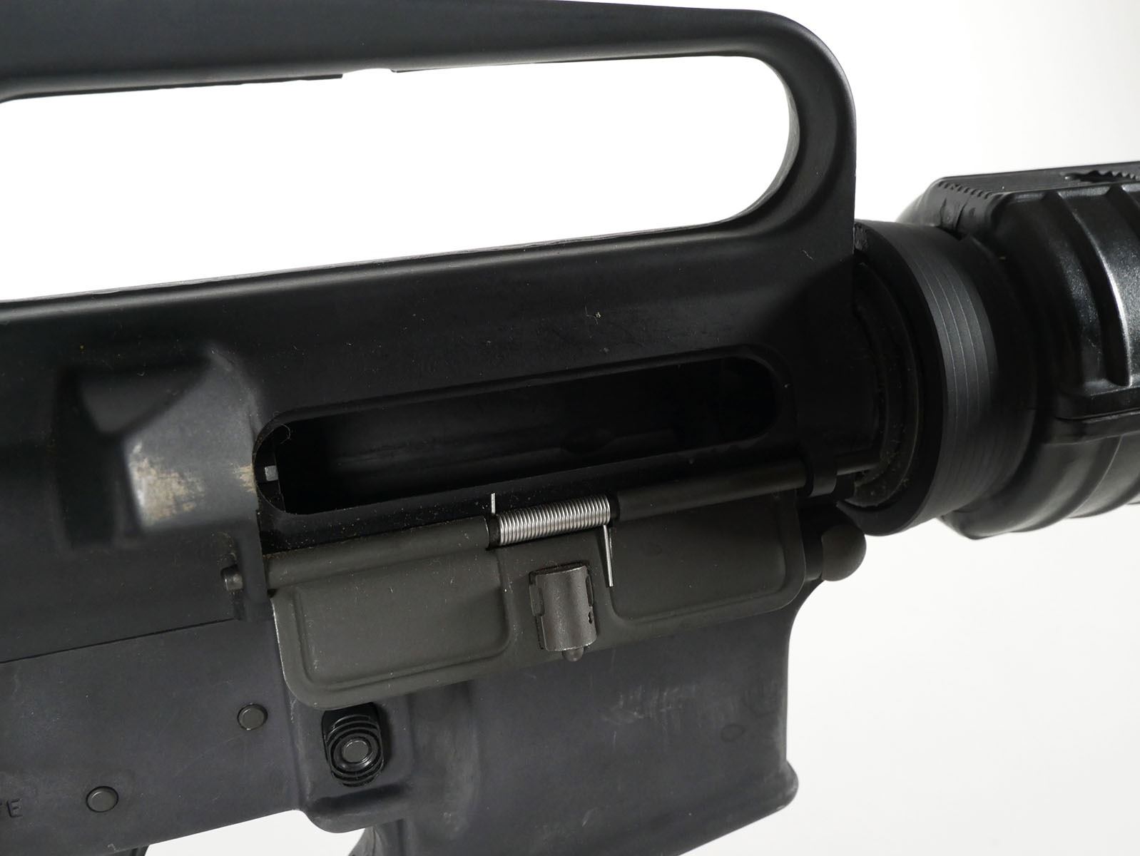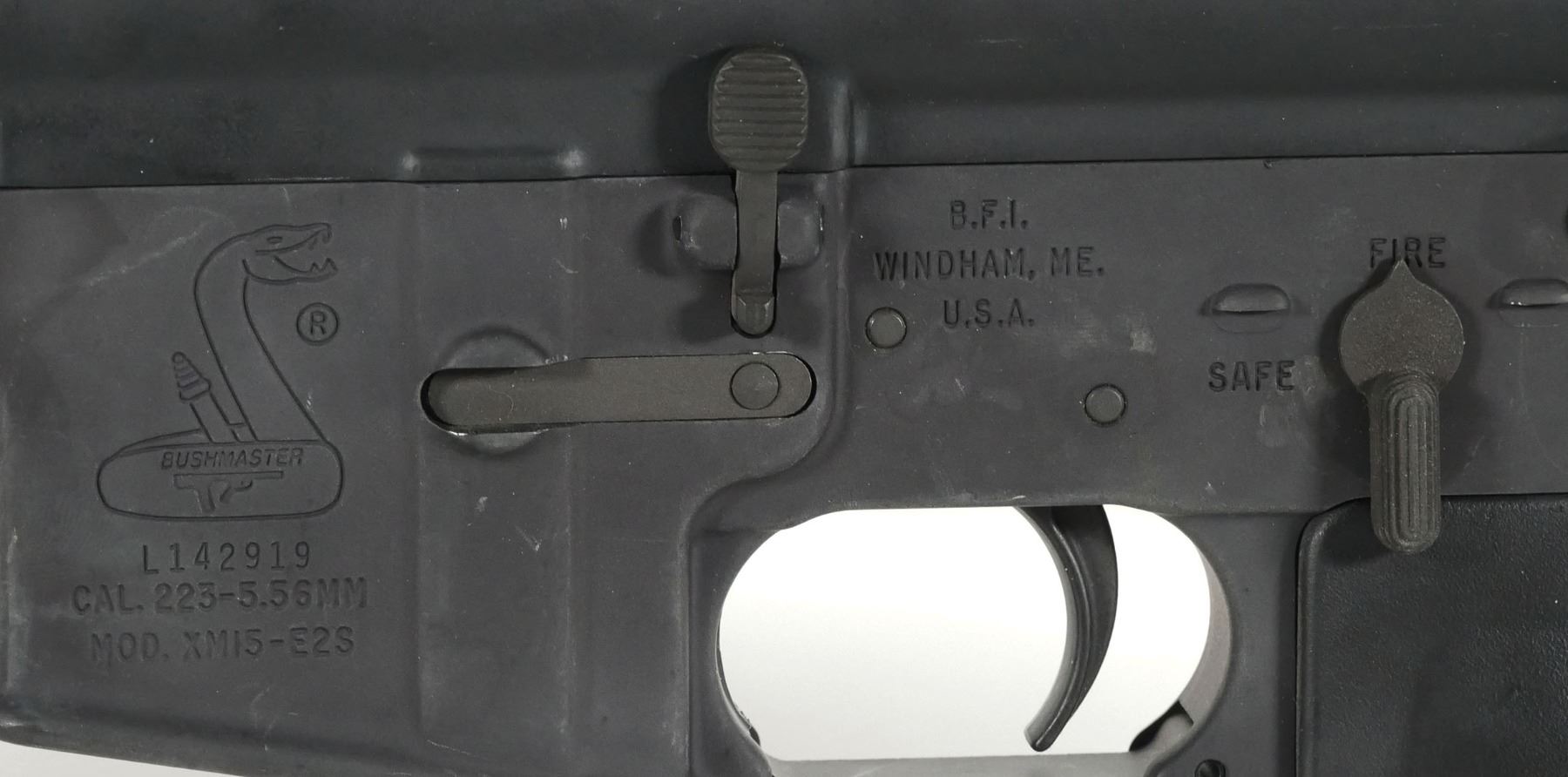 Bushmaster XM15-E2S AR 15 Style Semi Auto in .223rem/5.56mm NATO. Barrel measures 20". Serial #L142919. Finish has normal to light wear. Brass deflector has some finish loss. 3/4" scuff spot on left side of stock. Bore is clean with no dark spots. Please see our other lots for more firearms.